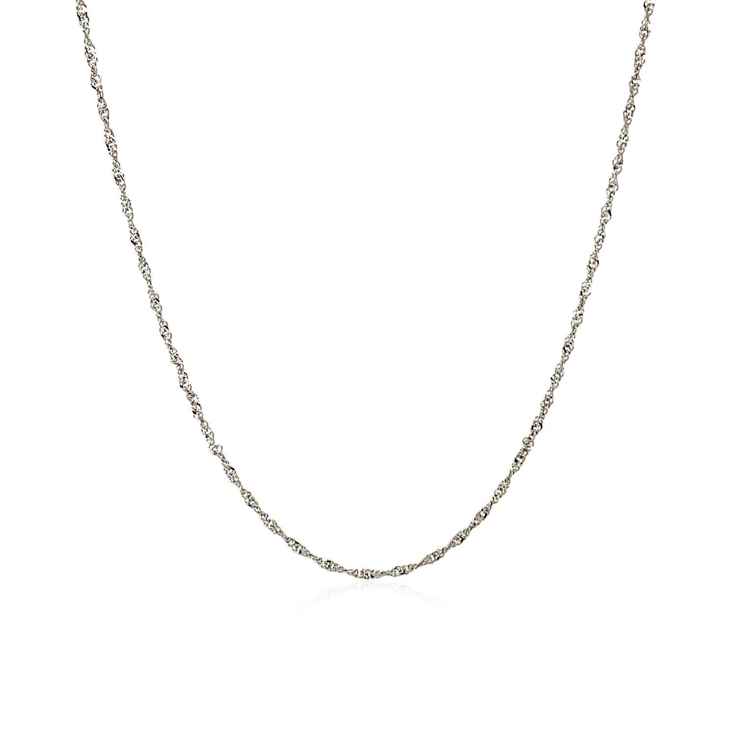 This Singapore chain comes in 10k white gold and has a width of 1.10 millimeters.