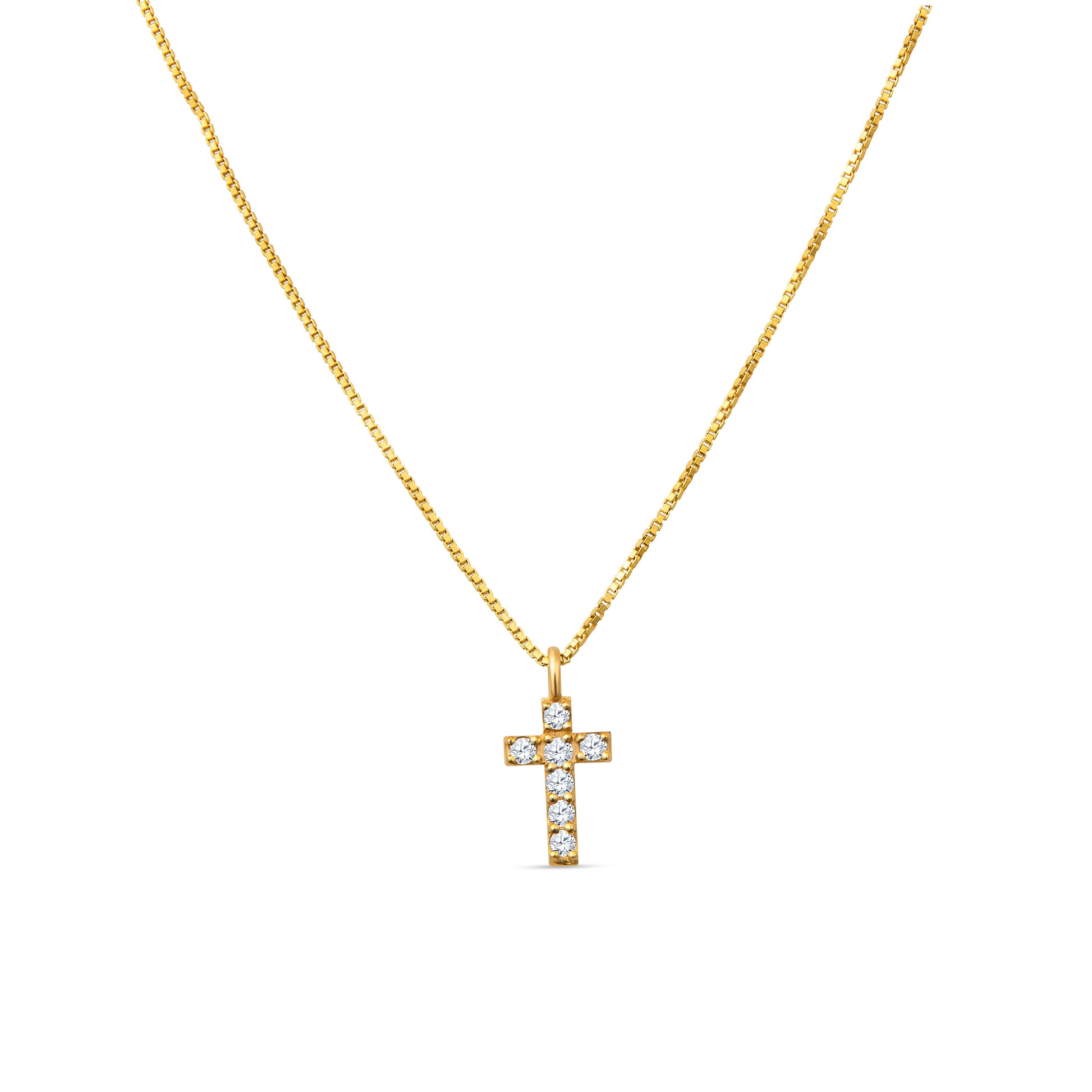 An elevated take on the best-selling necklace inspired by Christina's mom, the dainty diamond cross necklace is a beautiful everyday look. This cross necklace is crafted from 14K gold and inlaid with seven sparkling diamonds. A meaningful gift for birthdays, christenings, confirmations, anniversaries and more, this 14K gold cross necklace will be a treasured piece in your jewelry collection.