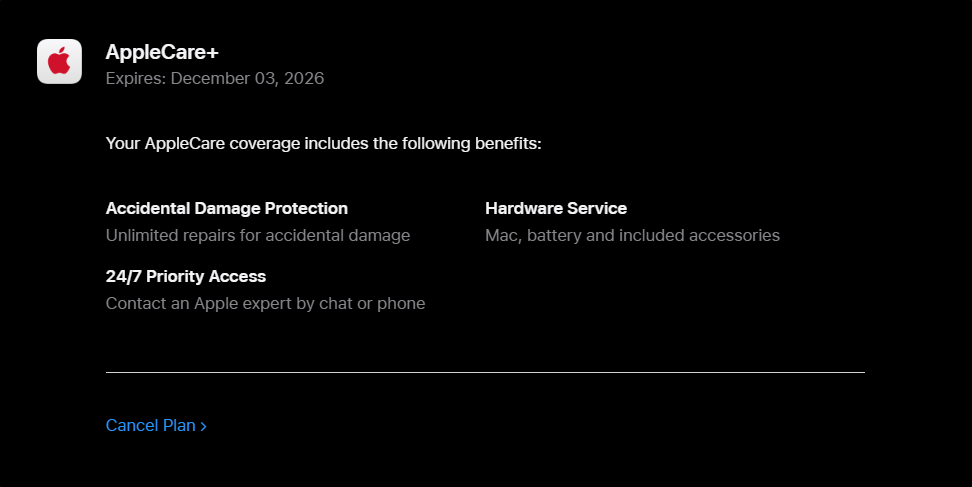 This MacBook Pro comes with AppleCare+ coverage valid through December 3, 2026, providing: