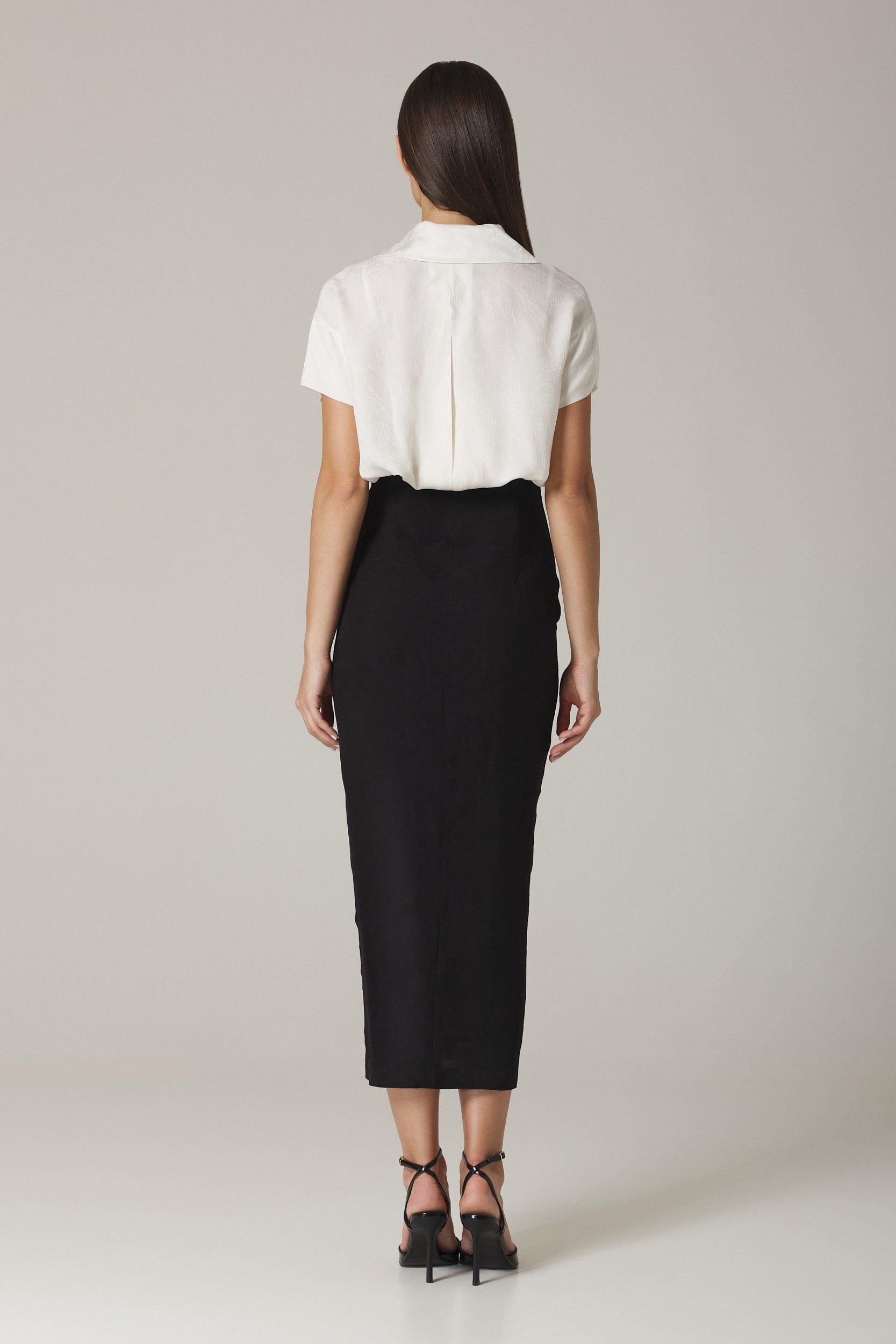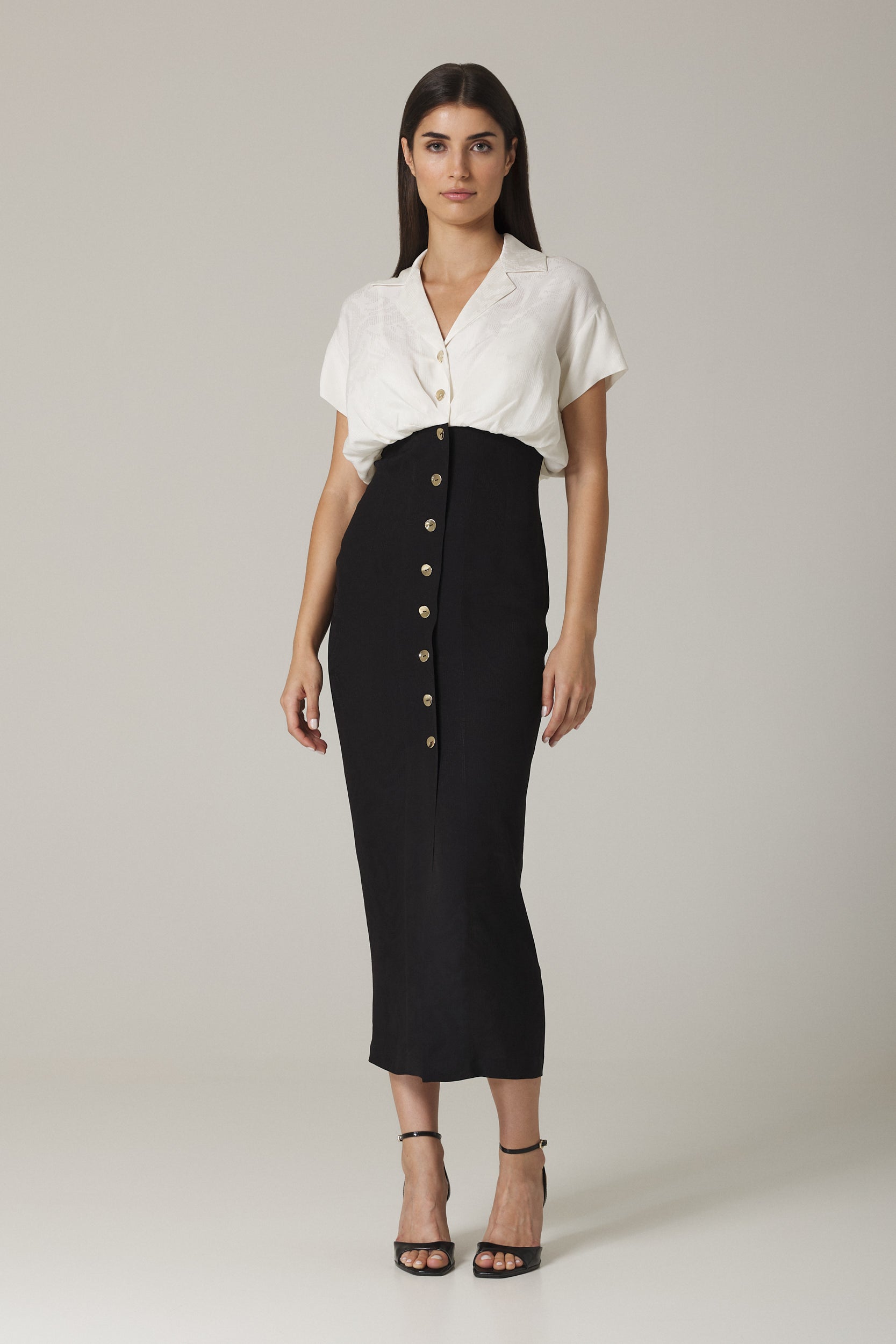 With its blouson shirt and curve hugging midi-length skirt, the Aida dress is the epitome of timeless femininity. Made from a lux viscose jacquard sourced from Italy the dress features a front placket closure with hammered gold metal buttons, drop shoulders and a flattering v-neckline. The shirt has a built-in soft bralette, that helps provide additional coverage and emphasize the blouson effect. Perfect for any occasion, wear yours with flat sandals for casual dinner, or with strappy heels to attend a party. Shown here in Soft White and Black color block.