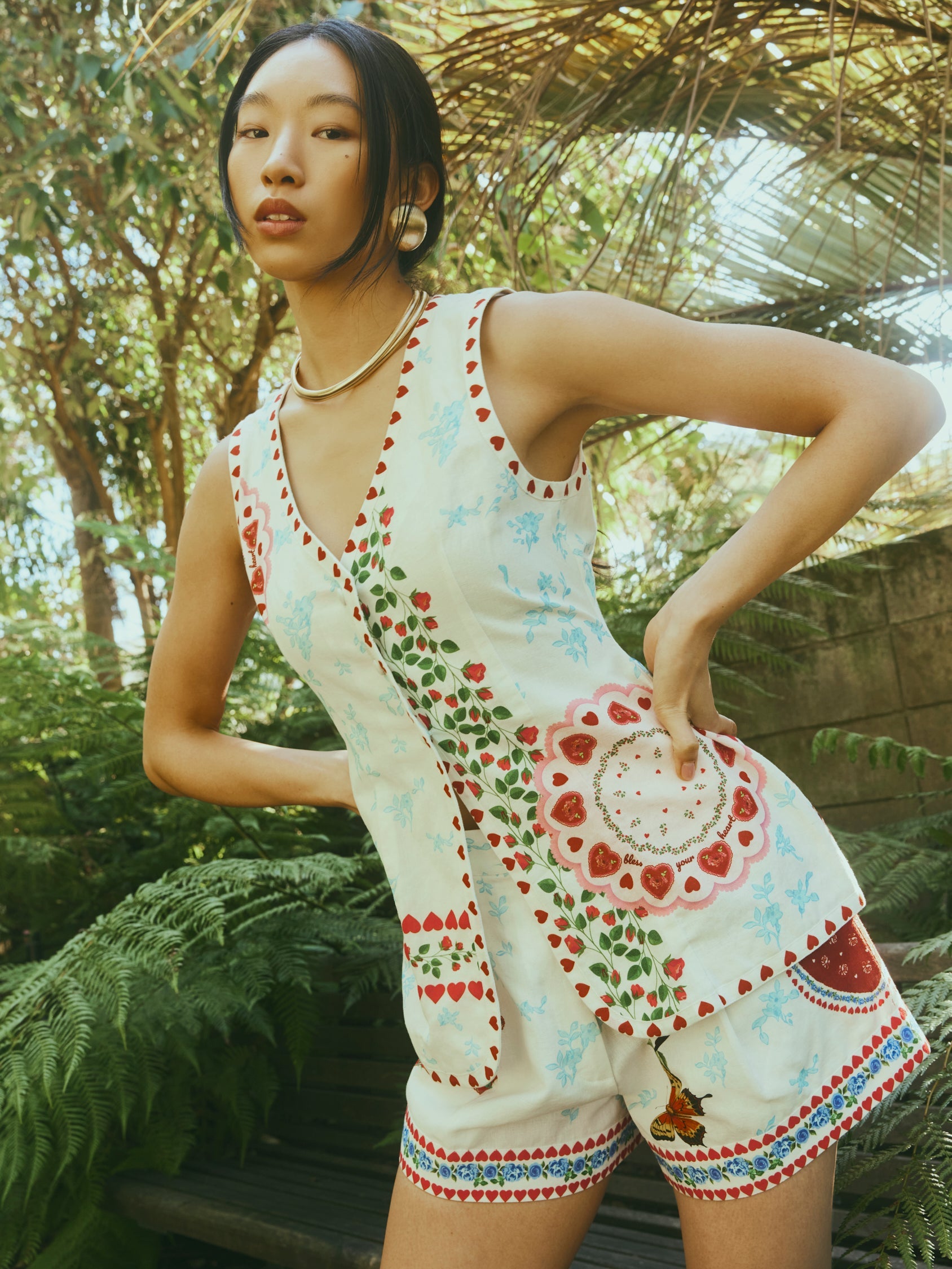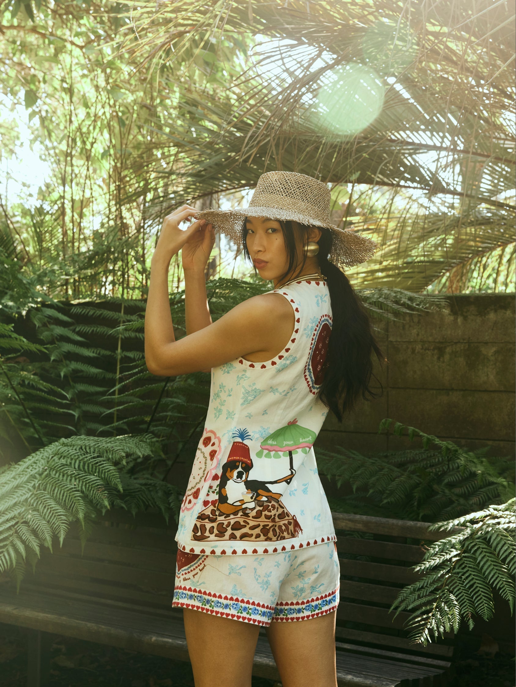 Meet Alexa, a chic tailored vest. This top is crafted in a cotton linen with a funky story print. Structured and cut for a sleek fit, finished with top to bottom buttons. Paired with Scottie Short.