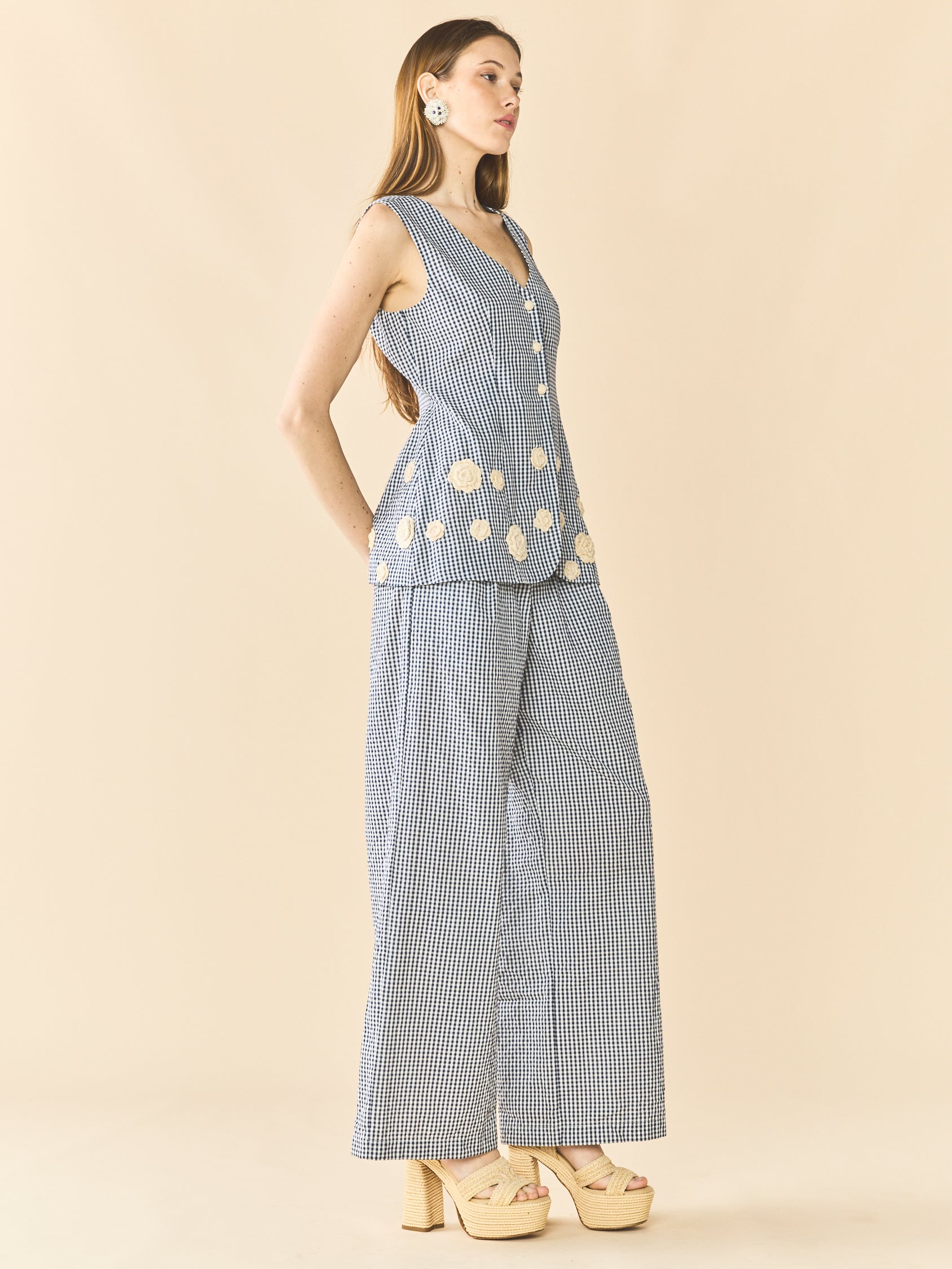 Meet Alexa, a chic tailored vest. This top is crafted in a 100% BCI cotton with handwoven crochet floral detailings. Structured and cut for a sleek fit, finished with top to bottom buttons. Paired with Nina Pant.