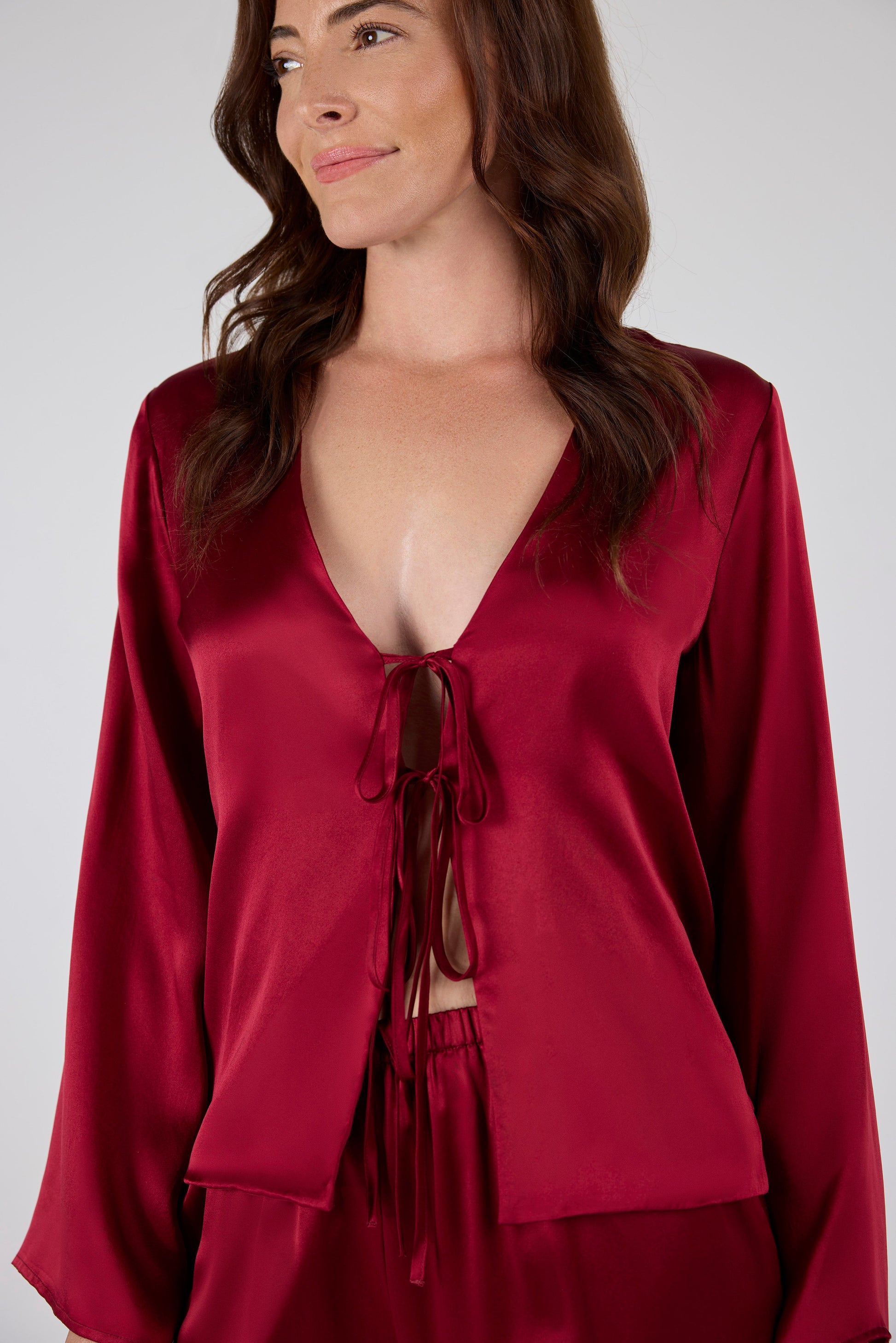 Timeless yet subtly sexy, this set features a buttery-soft fit with a tie-front design complemented by comfortable pants featuring high side slits for an effortlessly chic look.