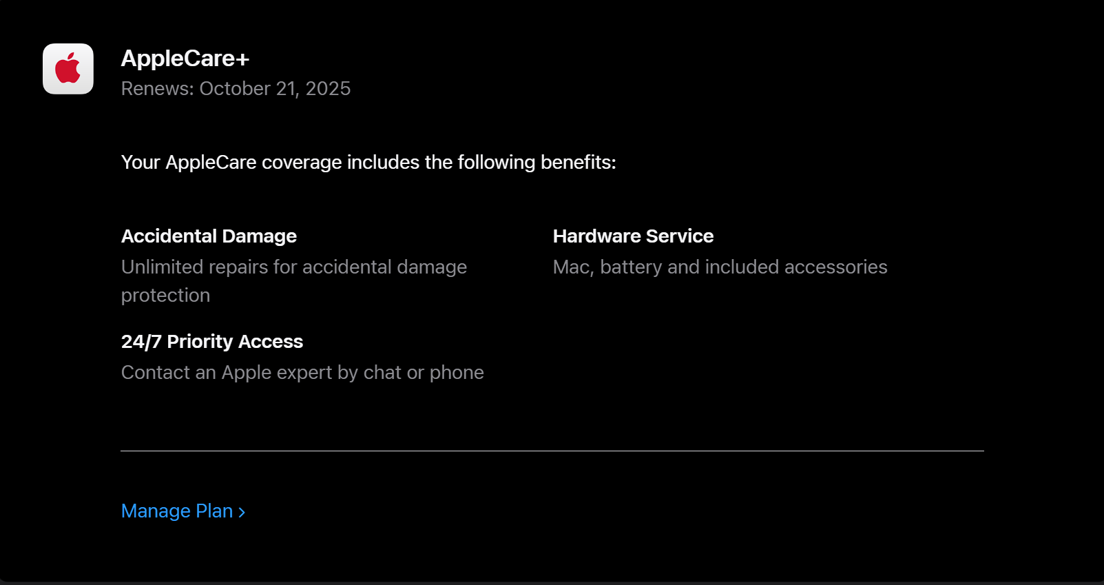 Comprehensive AppleCare+ Coverage until October 21, 2025