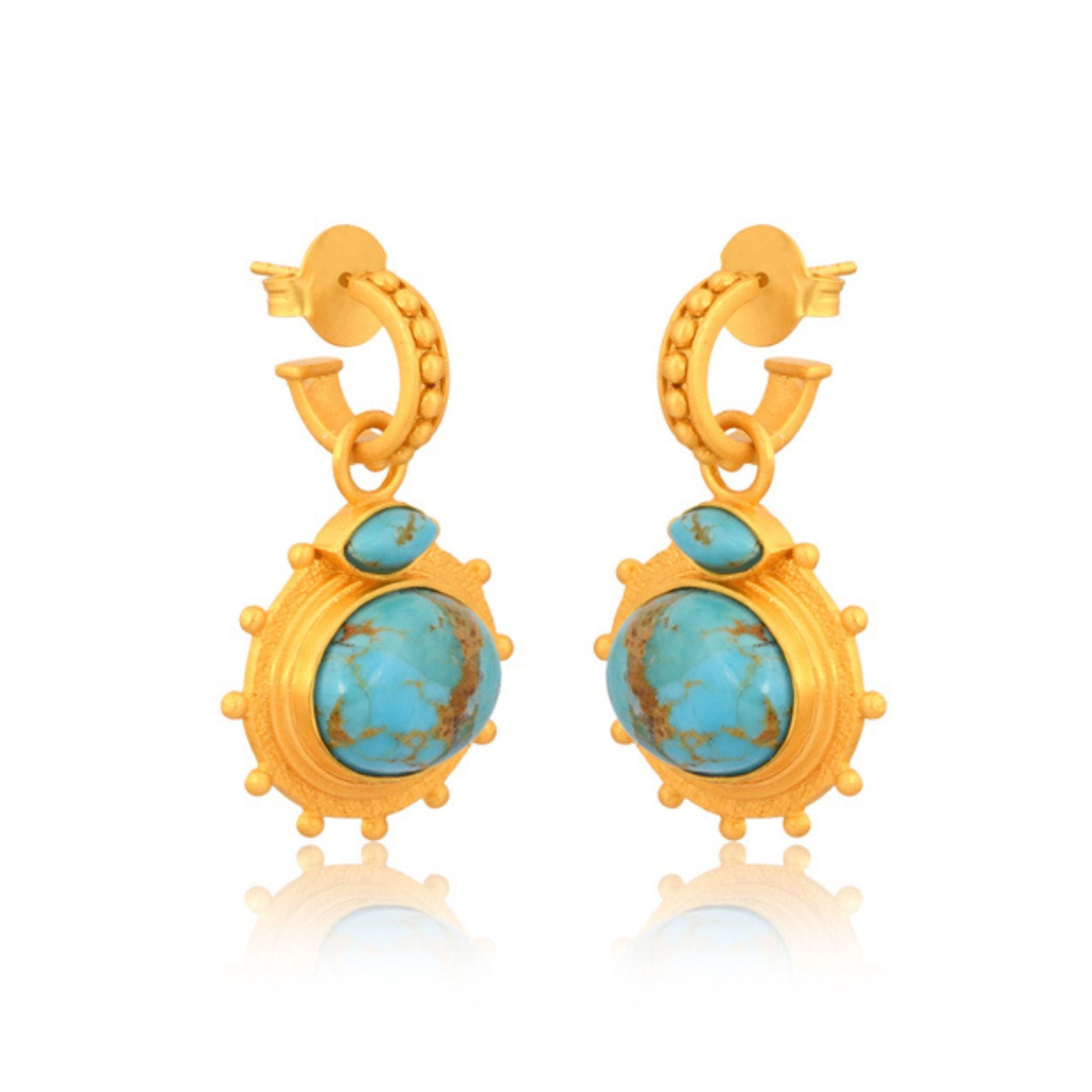 Make a splash in the Athena Drop Earrings. Featuring a small, studded hoop design with a sunburst pendant, this earring is crafted from 18K gold-plated brass with a hammered texture. A turquoise stone is the center piece of the pendant with a smaller turquoise stone set atop it. Perfect for everyday or elegant occasions, these statement earrings will radiate style for all of your favorite looks.