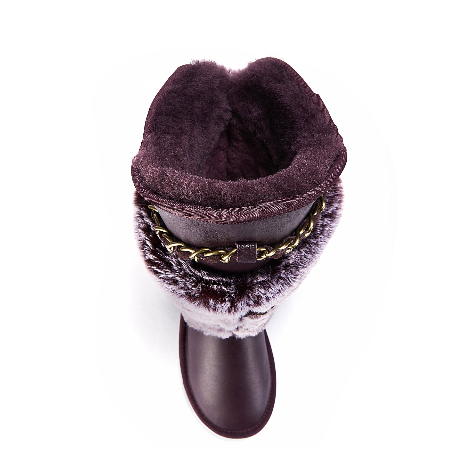 sheepskin boot tall boot fur trim chain detail winter boot sheepskin lined tall boot faux fur trim boots women's winter sheepskin boots below knee height boots stylish cold weather boots metal chain detail boots