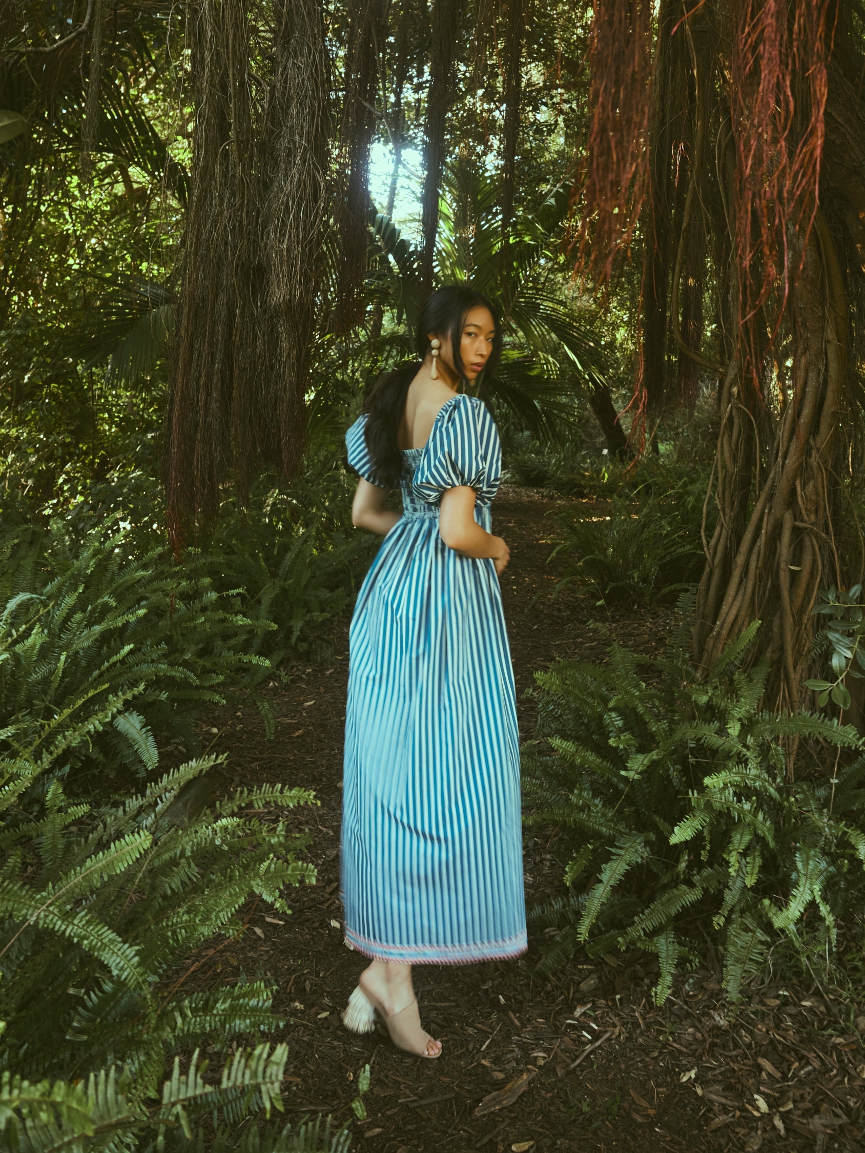 The Aurora is a daydream in a dress. The piece has perfectly tailored pleats, inverted ruffles hugging the bust, delicate puff sleeves, and flows along the lower body.