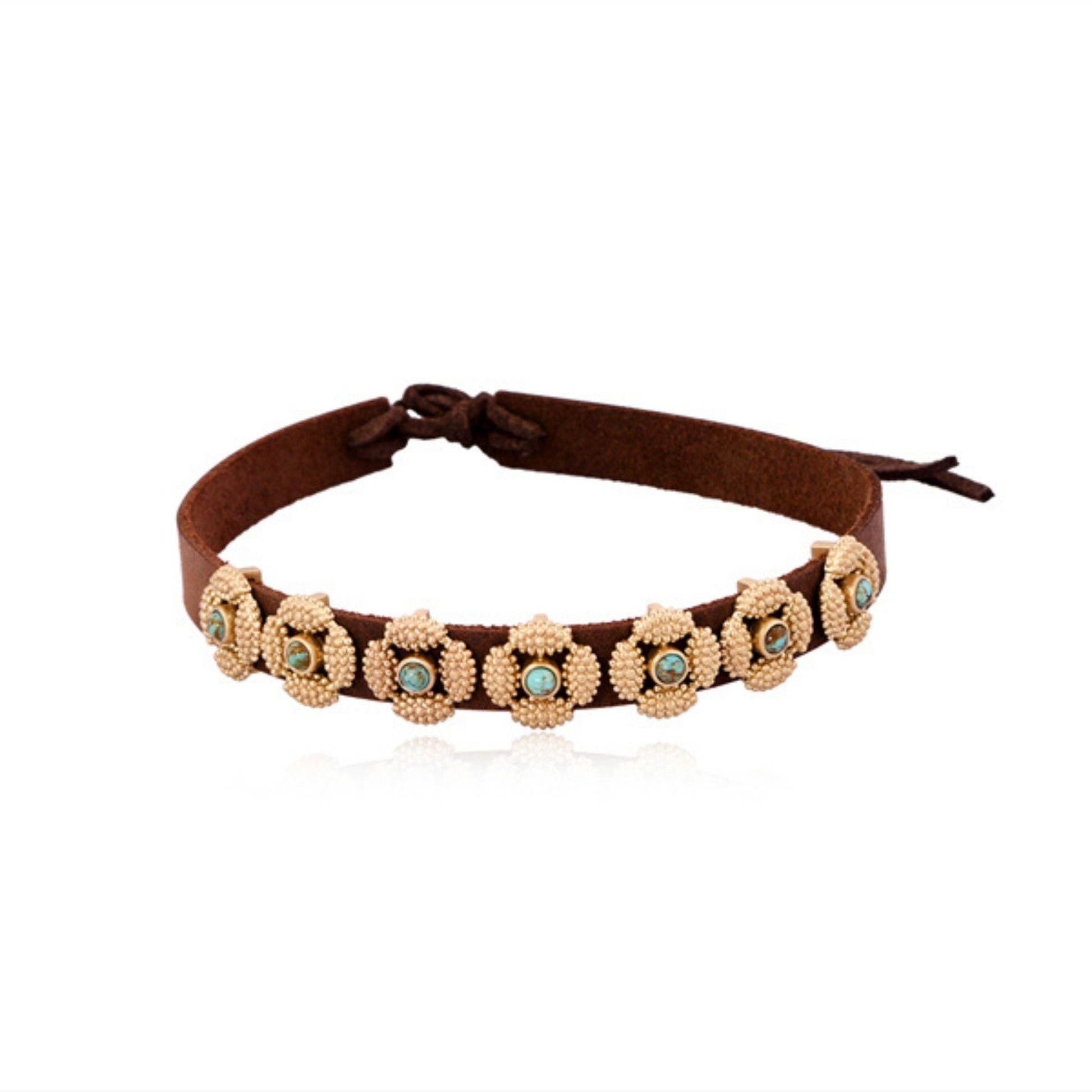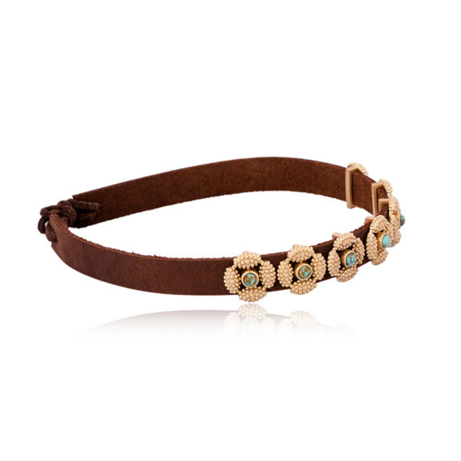 Elevate your favorite hats with the Azure Skies Hat Band. Featuring 18K gold-plated brass medallions with studded details and a turquoise stone center, this hat band is crafted from high-quality leather and is adjustable to fit all hats. Cluster the medallions together or space them evenly throughout the band to create your own unique styling on all of your favorite cowboy hats.