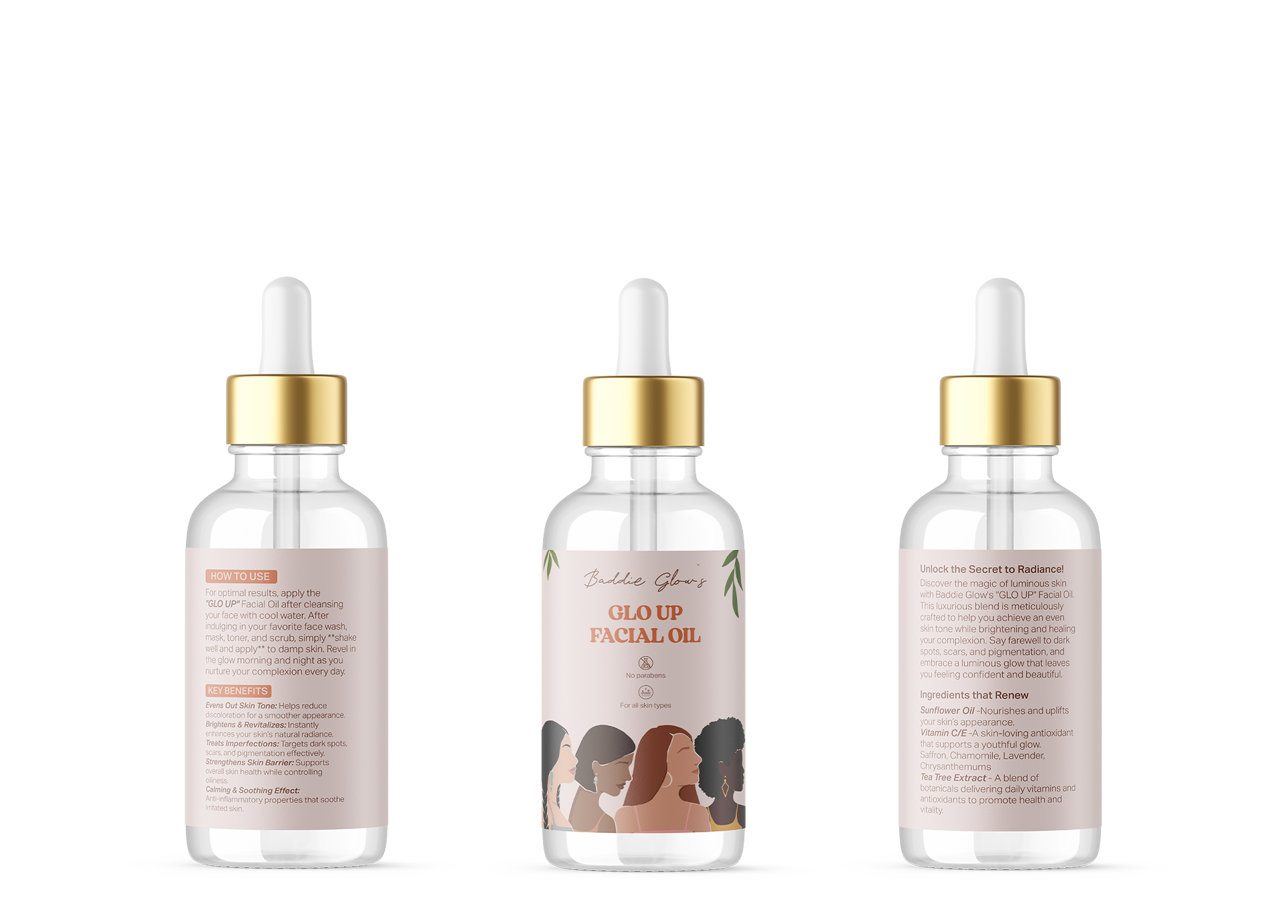 Discover the magic of luminous skin with Baddie Glow's "GLO UP" Facial Oil. This luxurious blend is meticulously crafted to help you achieve an even skin tone while brightening and healing your complexion. Say farewell to dark spots, scars, and pigmentation, and embrace a luminous glow that leaves you feeling confident and beautiful.