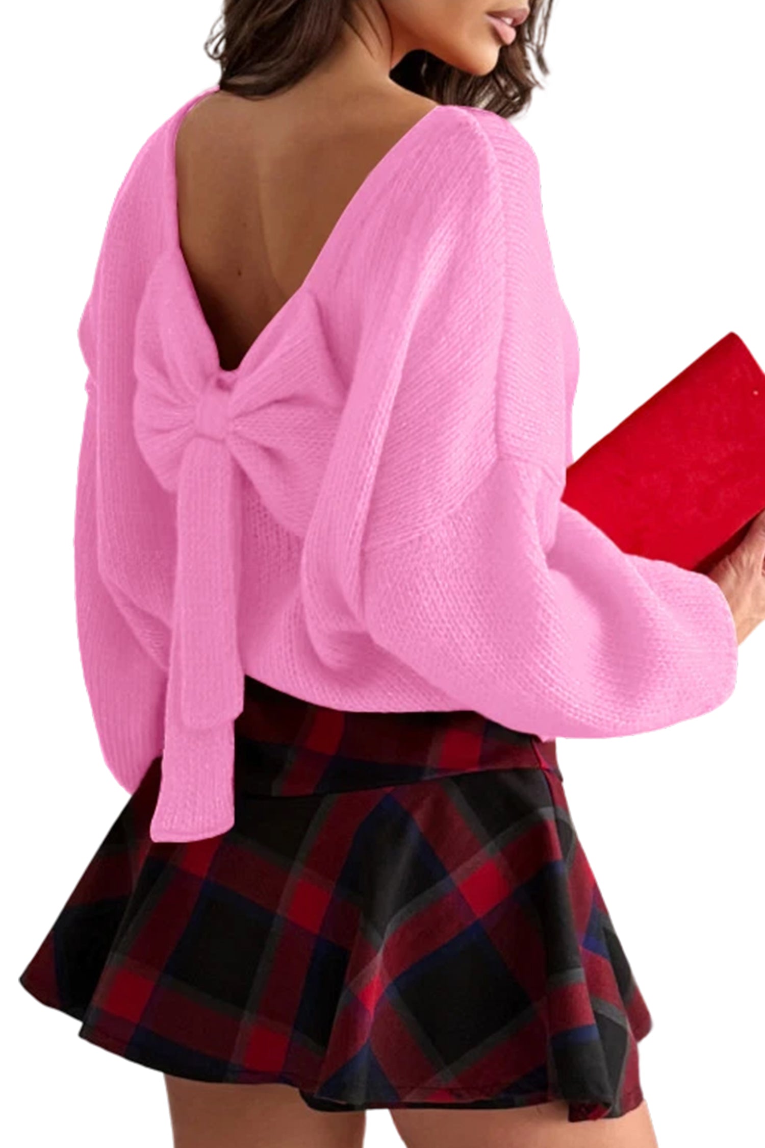 This black bow backless bubble sleeve sweater is made from 65% acrylic and 35% polyamide. It features a solid color design with a festive bow and a backless cut for added style. The bubble sleeves add an elegant and dressy touch. Suitable for women looking for a stylish sweater to wear with jeans or skirts. Ideal for holiday events or casual outings.