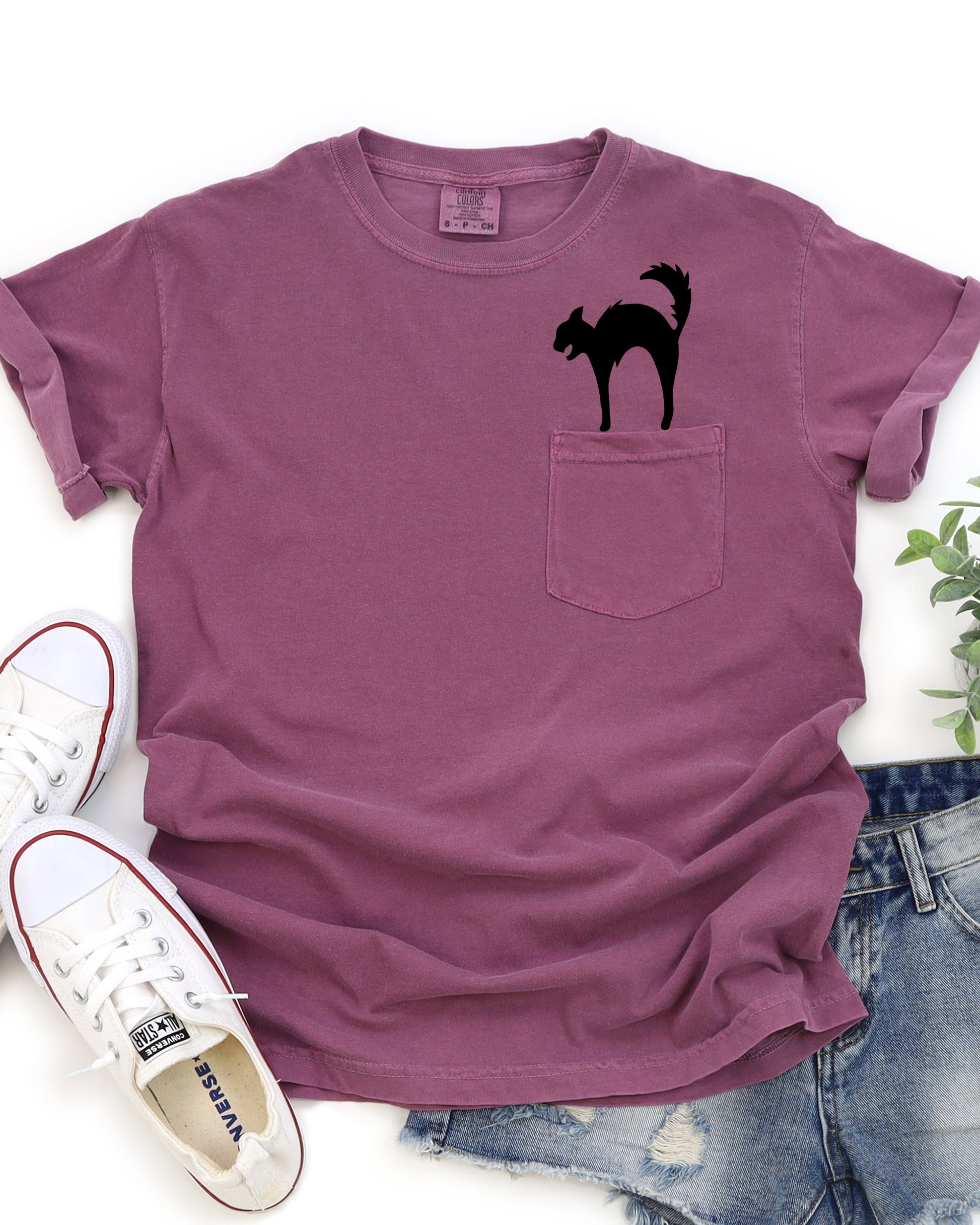 Halloween Pocket Spooky Witch Tee Comfort Colors T-Shirt Black Cat