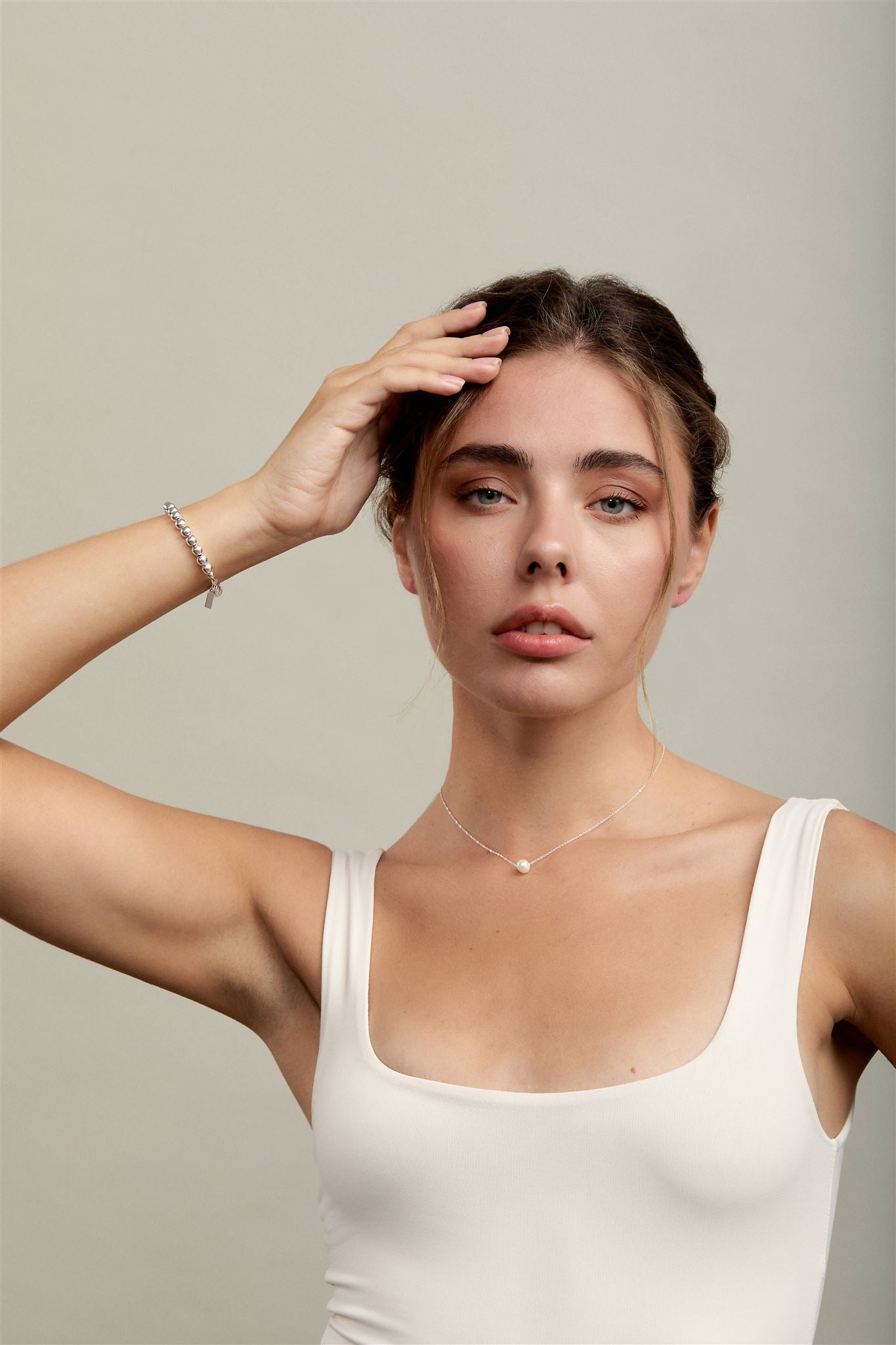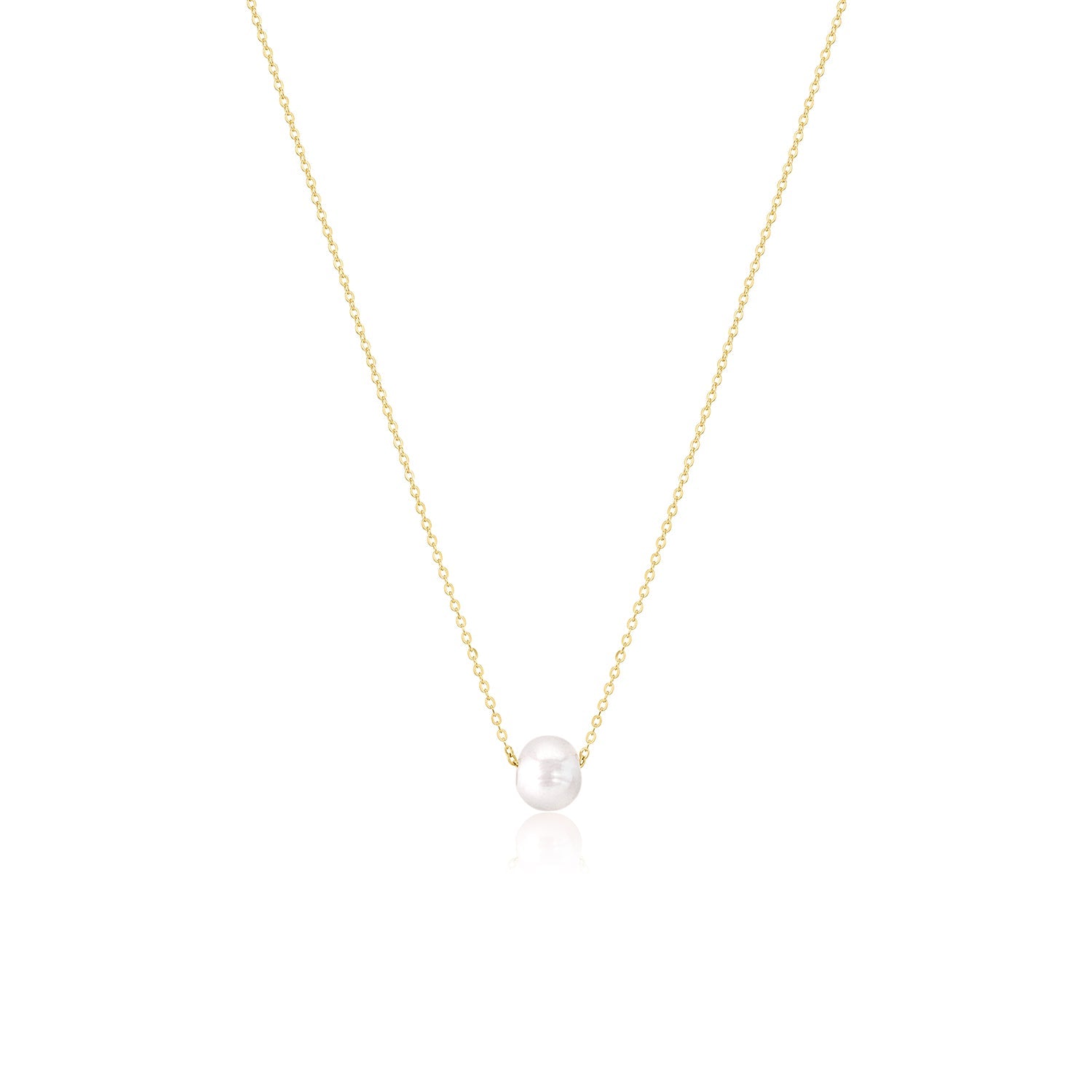 The Charlize Necklace features a cable chain made from either 14k gold filled or sterling silver. It includes a single floating freshwater or peacock pearl on a 16-inch chain secured with a spring ring clasp. This necklace is designed for those looking for elegant, delicate jewelry. Pearls naturally vary in appearance, and due to their softness, this piece requires gentle handling and should be kept dry.