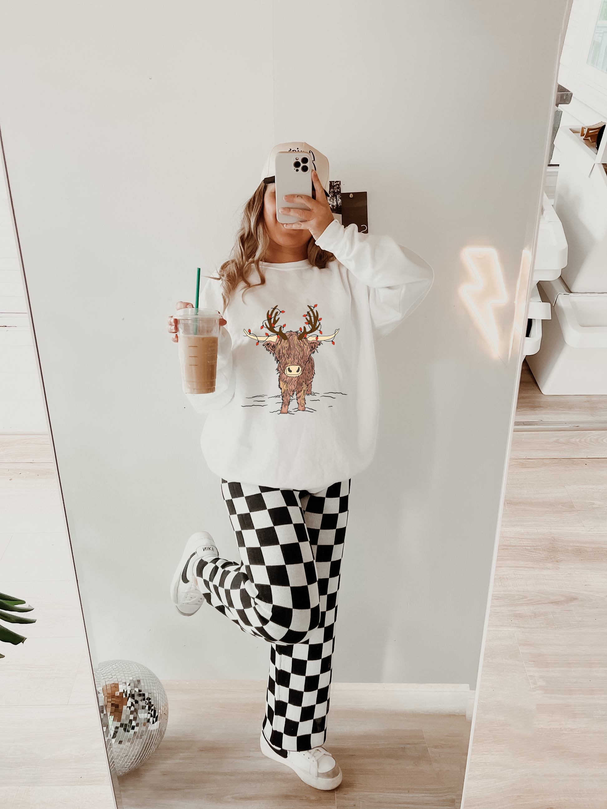 christmas tee holiday sweatshirt highland cow highland cow christmas tee christmas lights sweatshirt festive holiday clothing holiday themed tee warm christmas sweatshirt casual christmas wear