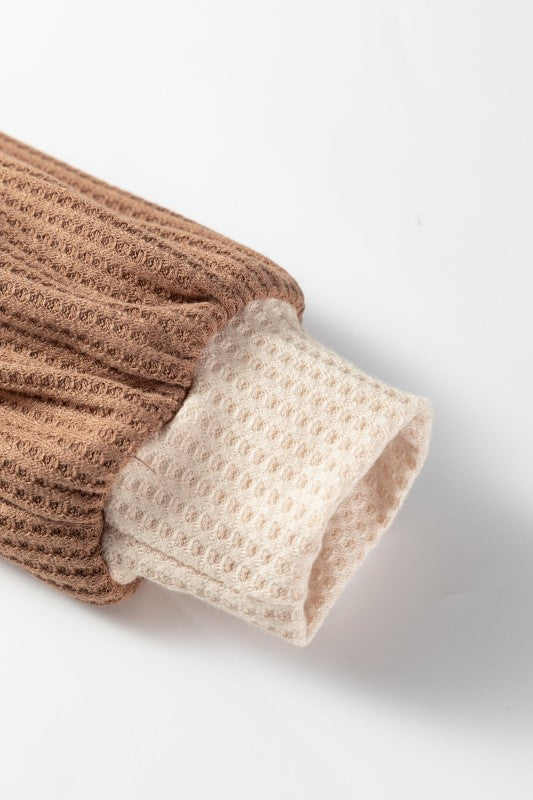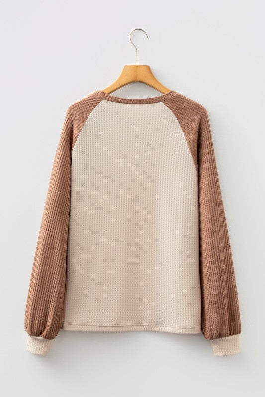 colorblock top waffle knit raglan sleeve knit top casual top waffle knit raglan sleeve top colorblock knit top relaxed fit layering top polyester viscose spandex top casual sporty raglan top everyday casual knit shirt