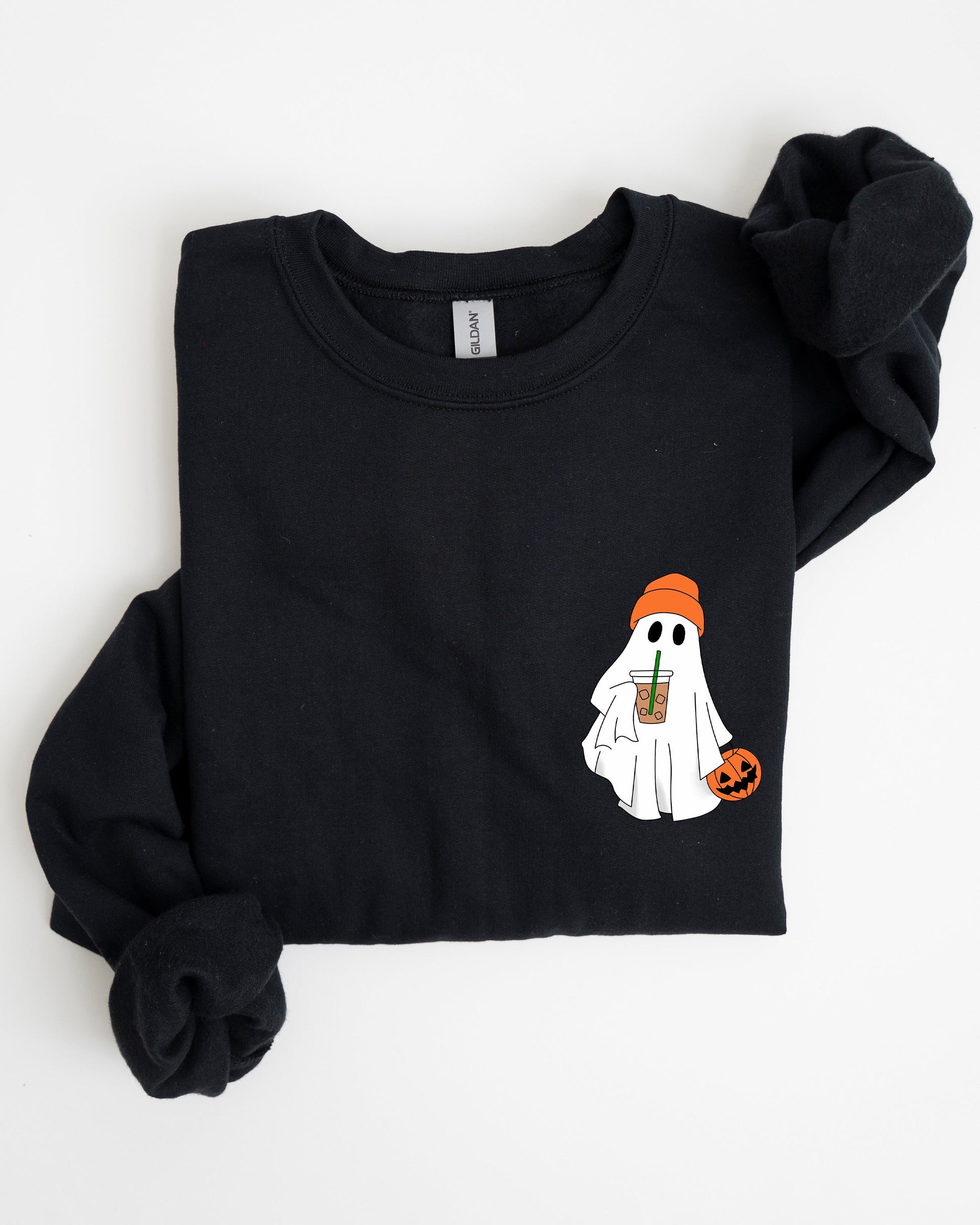 Cute Skater Ghost Pocket Print Halloween Coffee Trick or Treat Sweatshirt