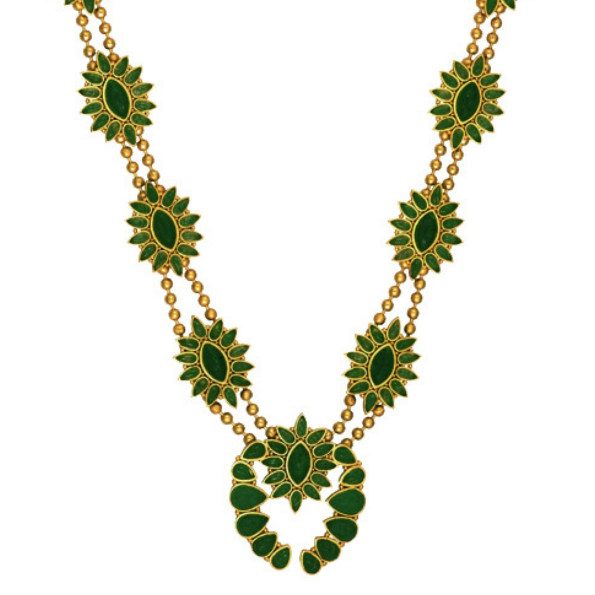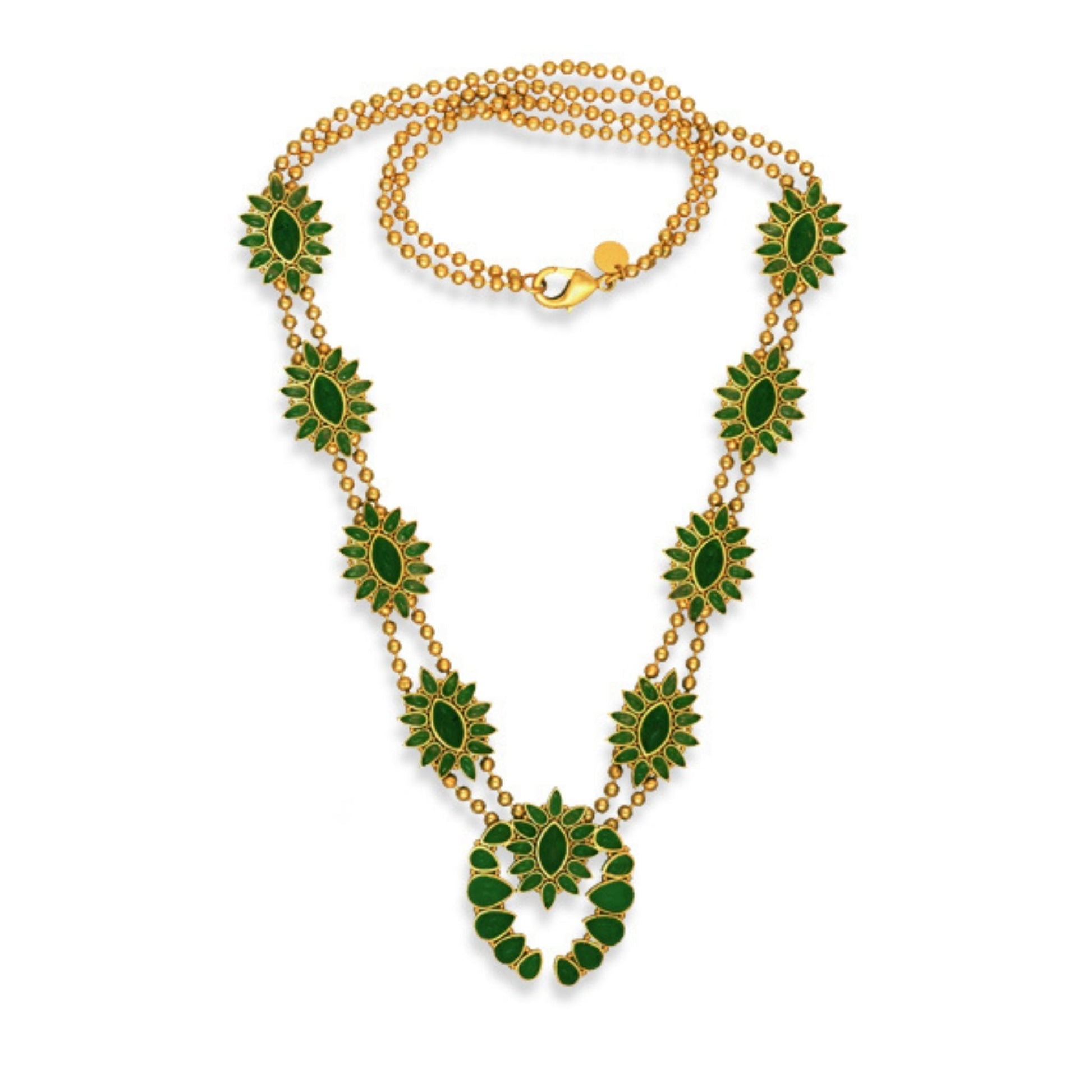 Meet the newest addition to our Squash Blossom family-- the Desert Squash Blossom Necklace in green strawberry quartz. Featuring our signature 18K gold-plated brass, this hypoallergenic necklace is a statement maker. Bold green strawberry quartz stone starbursts are inlaid between two gold beaded strands and flank the centerpiece of this statement necklace. The centerpiece features a starburst of green strawberry quartz and two gold-plated panels adorned with teardrop-shaped stones. This necklace features a lobster claw clasp for easy and secure wear. Paired with the Hummingbird Earrings or the Zion Cuff, this necklace makes an unforgettable look.