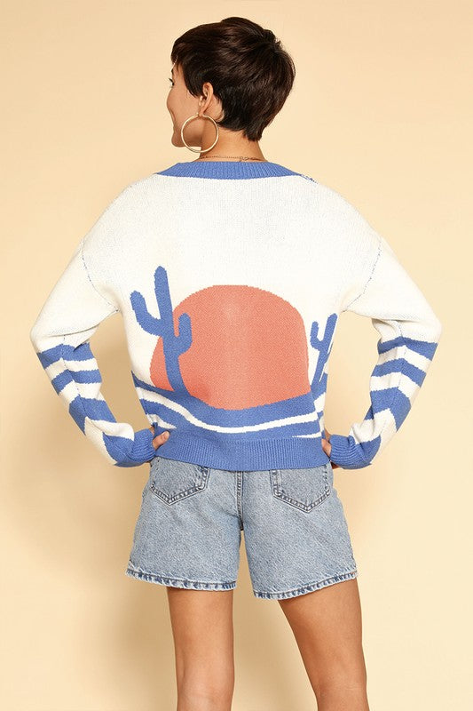 The desert sunset cardigan is a knit garment featuring a V neckline and button front closure. It includes a desert cactus intarsia design. Suitable for individuals seeking casual layering options, it is worn over tops or dresses for added warmth and style.