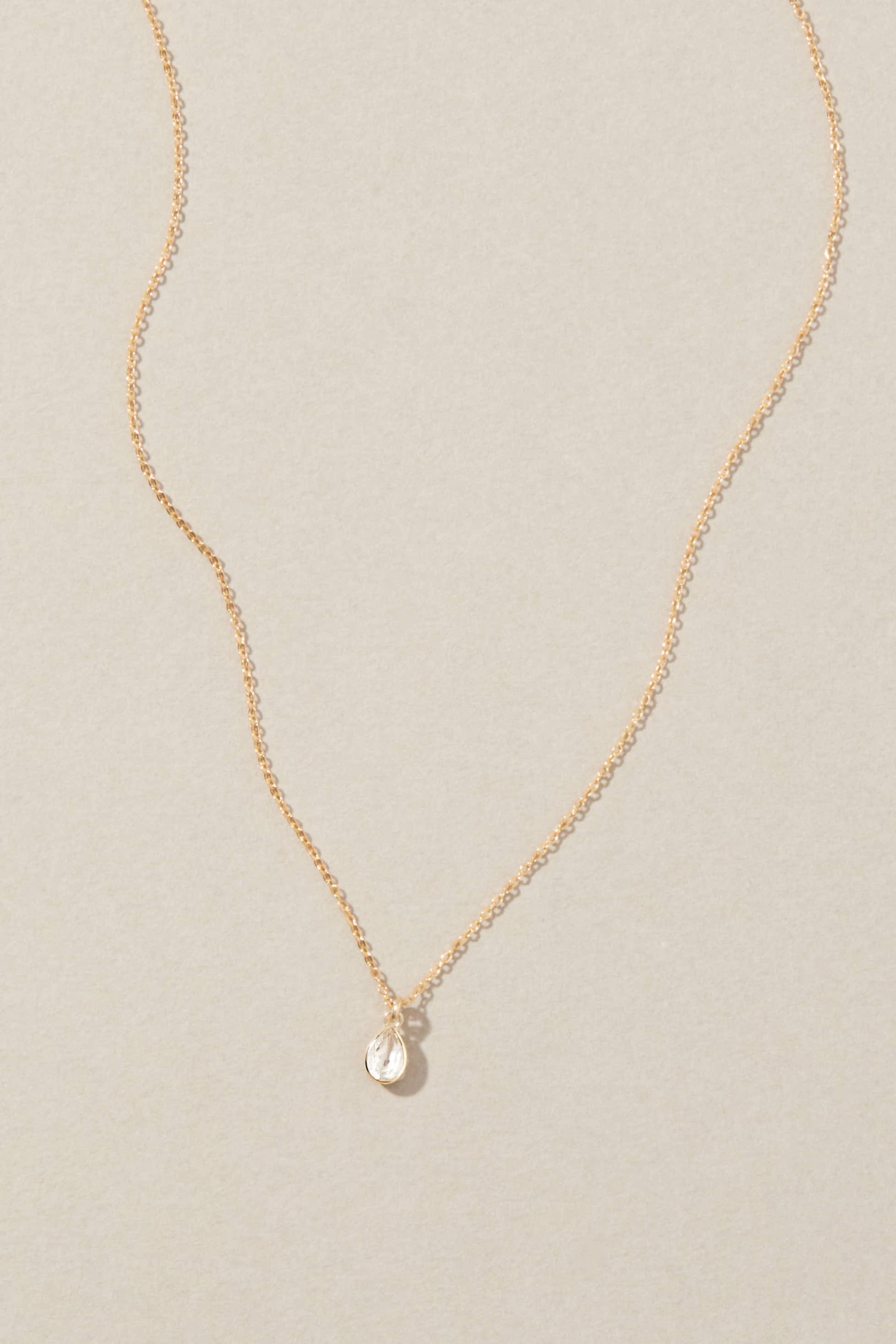The Everett Necklace features a 14k gold filled chain measuring 18 inches with a 14k solid gold bezel set teardrop charm made of white topaz. Designed for those seeking a delicate and elegant accessory, this necklace is worn around the neck using a spring ring clasp for secure fit and easy wear.