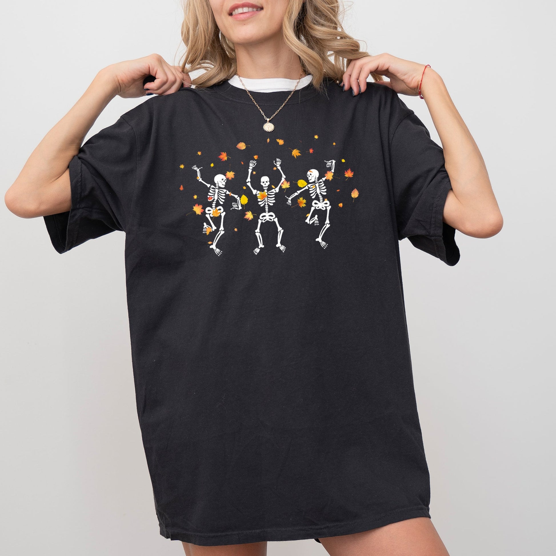 This Fall Leaves Dancing T-shirt is a Comfort Colors 1717 Graphic Tee made of 100% ring-spun cotton, offering softness and durability. Designed with a vintage aesthetic and eye-catching graphics featuring skeletons, ghosts, witches, and skulls, it caters to individuals looking for a Halloween costume or casual themed attire. Available in unisex sizing from S to 2XL, it is easy to care for and machine washable. This tee pairs well with jeans or layers beneath a blazer for varied looks.