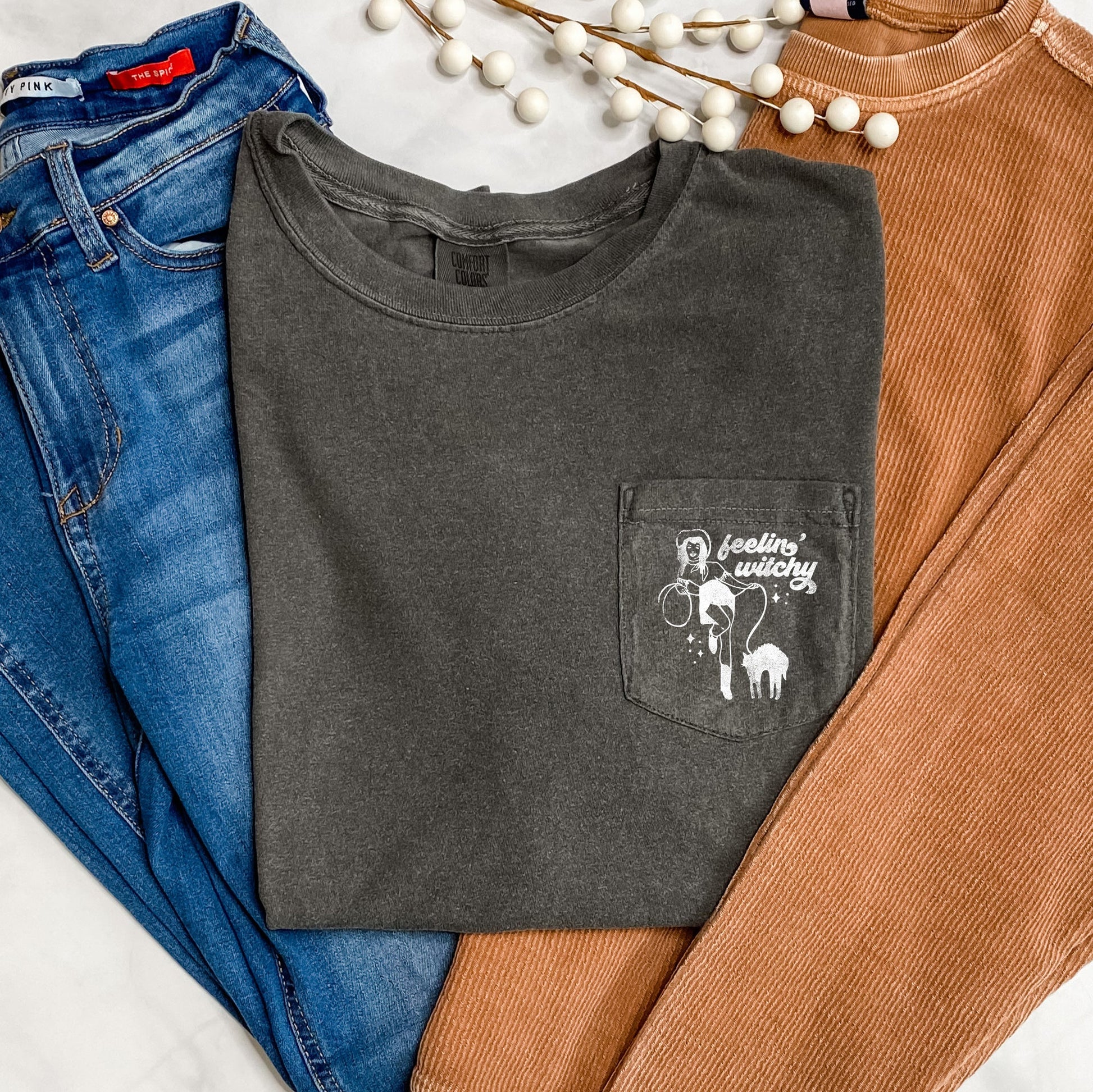 Halloween tshirt cotton tshirt pocket tshirt unisex shirt Feelin Witchy Halloween tshirt Comfort Colors cotton tshirt Halloween casual wear tshirt soft printed cotton tshirt unisex fitted Halloween shirt ring-spun cotton tshirt