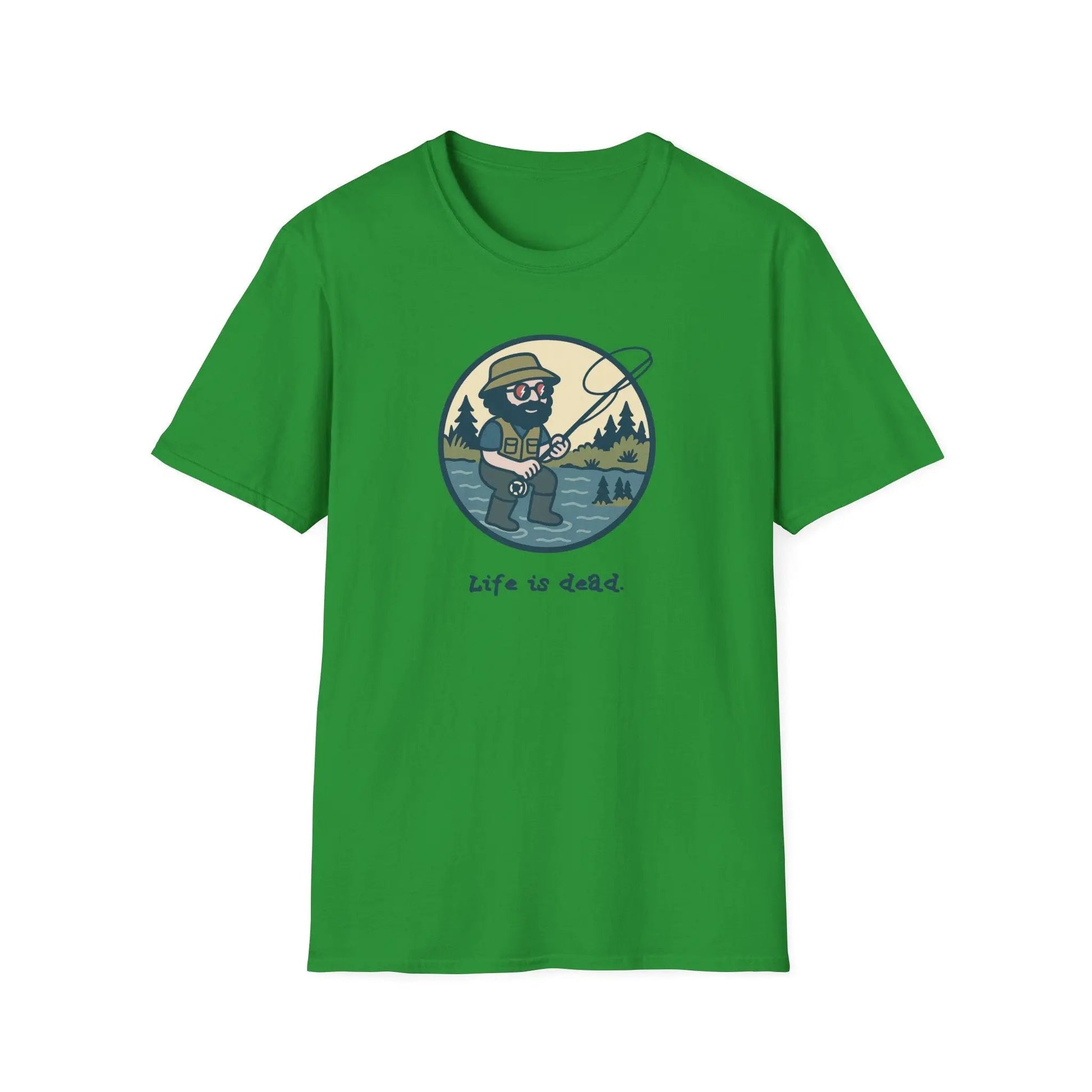 The Grateful Dead Life is Dead T-Shirt 'Fly Fishin Jerry' is a unisex soft-style shirt made from 100% ring-spun cotton for solid colors and cotton-polyester blends for heather shades. Designed for fans of the Grateful Dead and casual wearers, it features a relaxed graphic of Jerry Garcia and offers a lightweight, breathable fabric suitable for summer and everyday use. The classic fit and crew neckline provide versatility for different occasions including outdoor lounges, concerts, and casual outings. Shoulders are reinforced with twill tape, and the ribbed collar prevents curling. The shirt includes a pearlized, tear-away label for comfort and is ethically produced with certified US cotton.