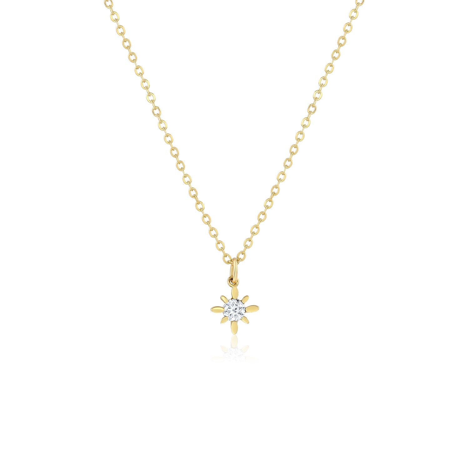 The Geneva Necklace is a fine jewelry piece featuring a 6mm compass star charm with a .02ct champagne diamond on a 16-inch chain. Available in 14k yellow or white gold, it is designed for those seeking a subtle, elegant necklace suitable for various occasions. This necklace is easy to wear daily and complements different styles.