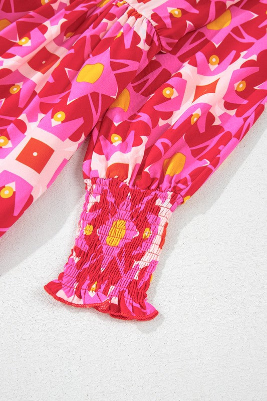 Geometric Print Smocked Long Sleeve Mini Dress