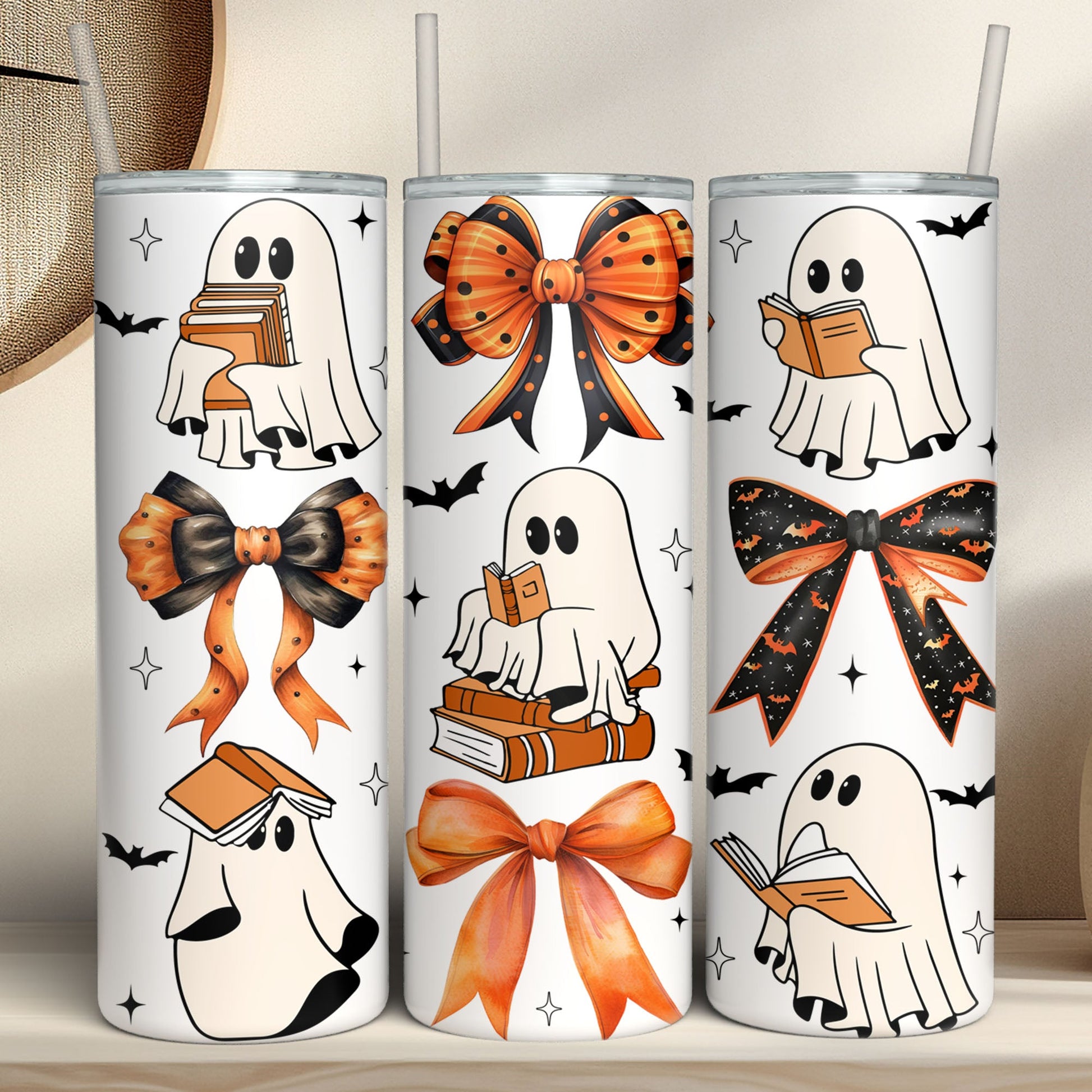 Ghost Book And Bowtie Tumbler, Cute Halloween Tumbler, Halloween Skinny Tumbler.