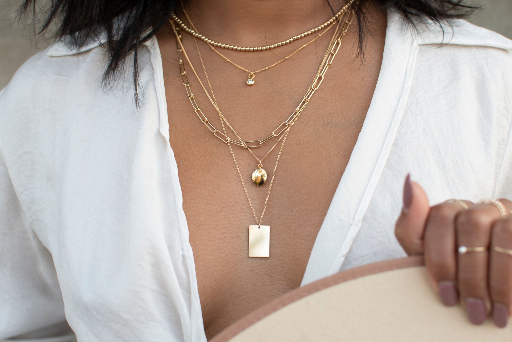 This Goldie necklace features a 14k gold filled 0.5x0.75 inch rectangle pendant with hand stamped "MAMA" text aligned to the right. The pendant hangs on a 20-inch chain. It is designed for those seeking a simple and meaningful accessory to wear daily or gift to a mother.