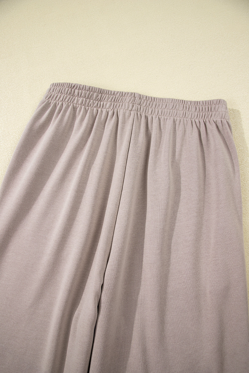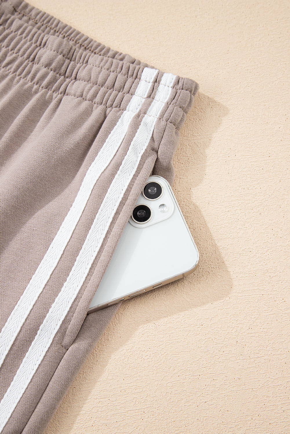 This Gray Morn varsity striped detail outfit includes a crewneck pullover and elastic sweatpants. The pullover is designed with a cozy fit suitable for daily wear, featuring a varsity stripe for a sporty look. The high-waisted elastic sweatpants offer a snug, comfortable fit. This two-piece outfit is ideal for individuals looking for casual, comfortable clothing for errands, workouts, or relaxing at home.