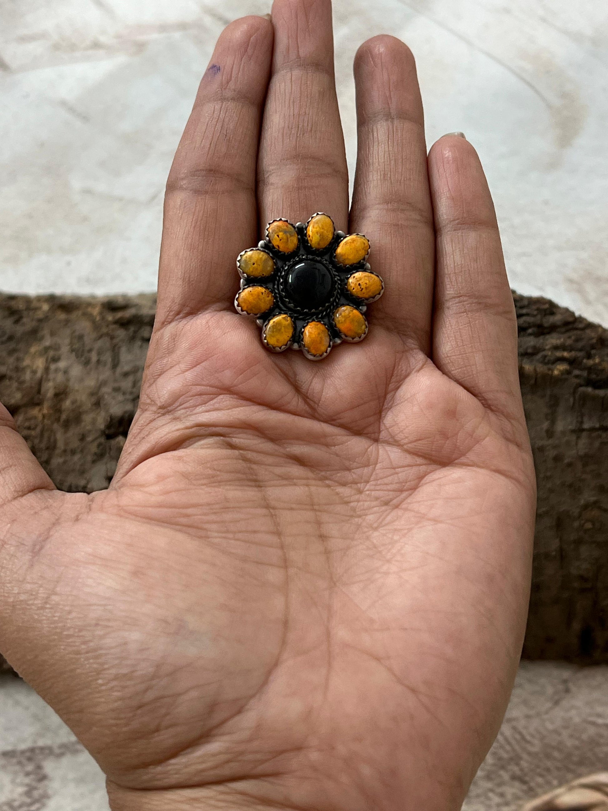 "Halloween Collection" Handmade Sterling Silver Black Onyx, Bumblebee Adjustable Ring with Signed Nizhoni