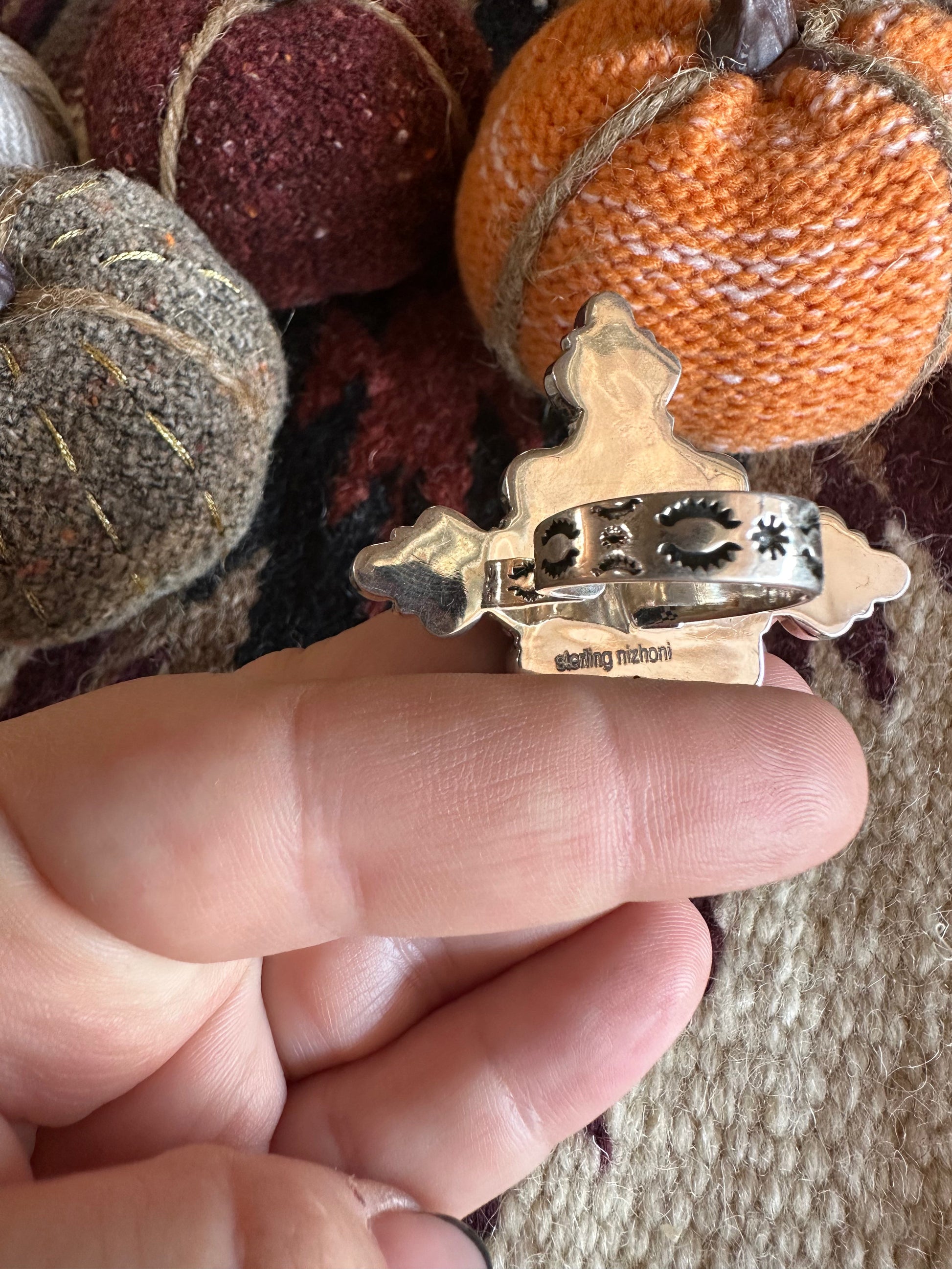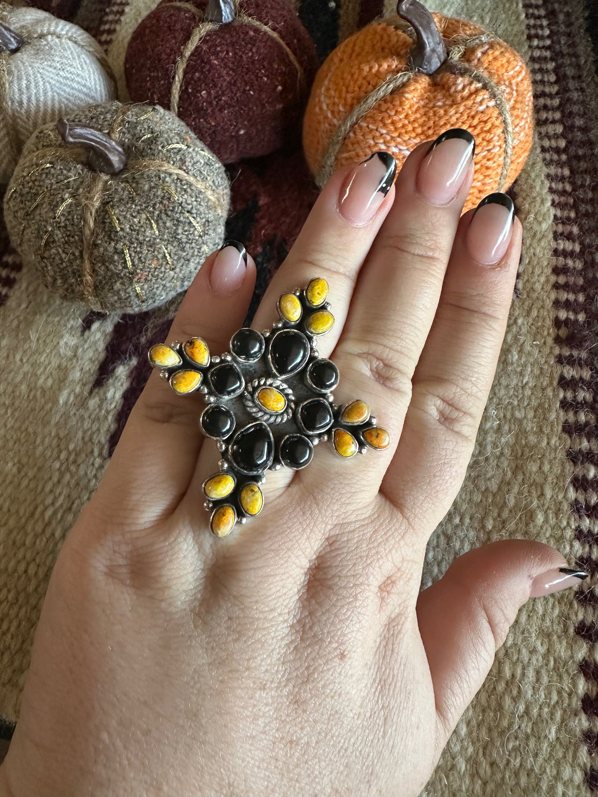 This adjustable ring from the Halloween Collection by Nizhoni Traders LLC features black onyx and bumble bee stones set in sterling silver. The ring measures approximately 2 1/4 inches long and 2 inches wide, adjustable to fit any finger size. It is designed for those looking for unique jewelry pieces suitable for Halloween or special occasions. The set includes a matching necklace.