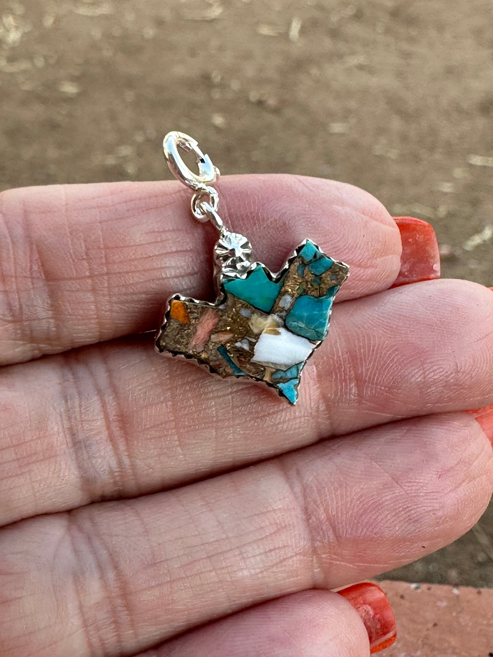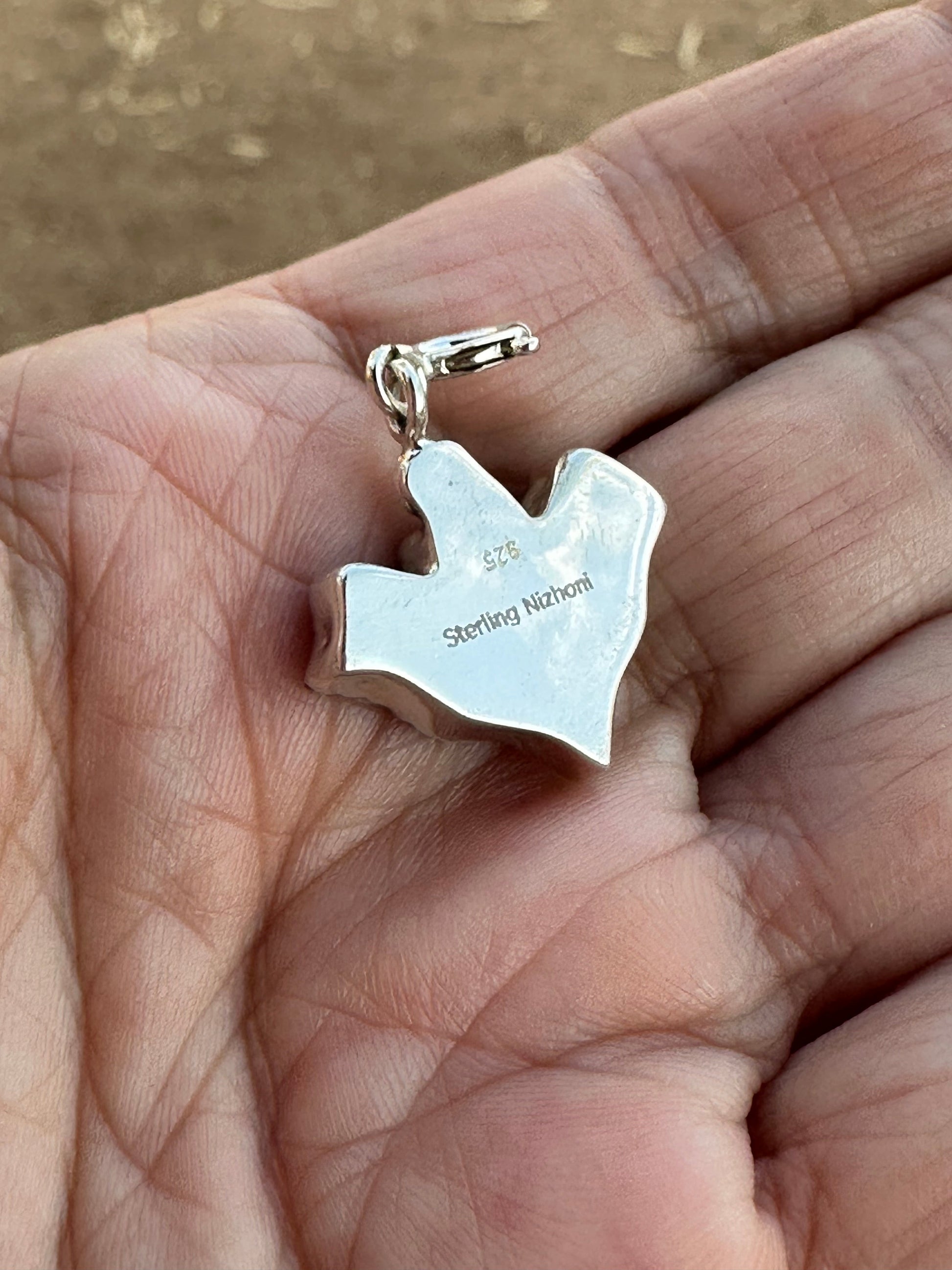 This product is a sterling silver spice bat charm from the Halloween Collection by Nizhoni Traders LLC. It is a handmade charm with a diameter of 3/4 inch. Ideal for customers looking to customize their jewelry or charm bracelets with seasonal themed accessories. The charm is made of sterling silver with a spice stone detail and is crafted without tags.
