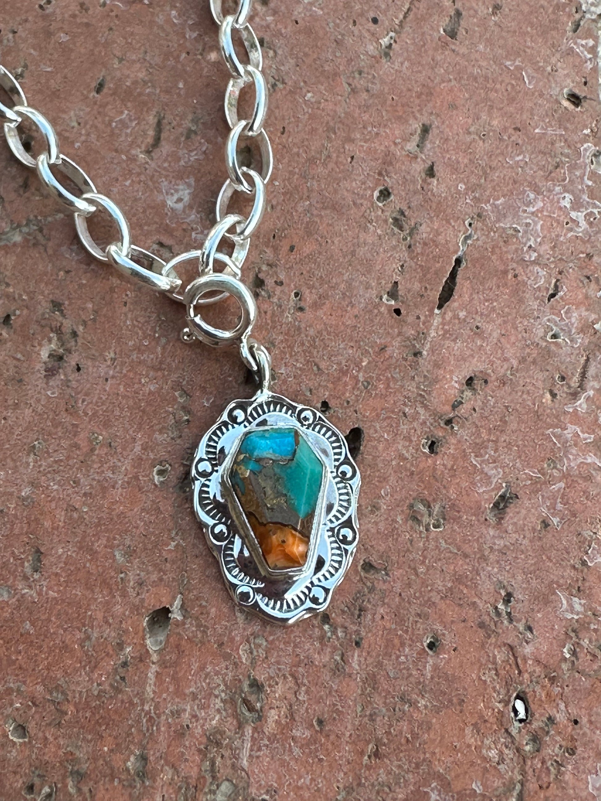 This sterling silver spice coffin charm from the Halloween collection by Nizhoni Traders LLC is a handmade jewelry piece approximately 3/4 inch in diameter. Designed as a charm, it is ideal for adding a themed accent to charm bracelets or necklaces. Made of sterling silver with spice stone detail, it suits customers looking for unique, artisanal jewelry charms.