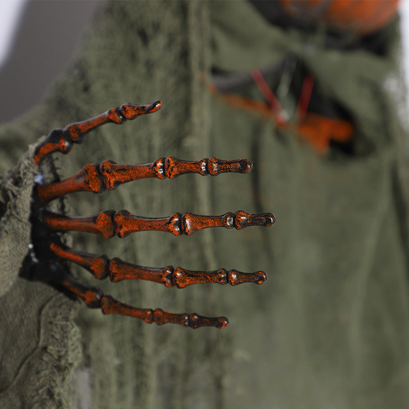 This pumpkin hanging ghost is a Halloween decoration made of plastic with green clothes. It features electric voice control and is suitable for haunted house setups or spooky holiday displays. The product includes one horror prop designed to hang and create a frightening atmosphere.