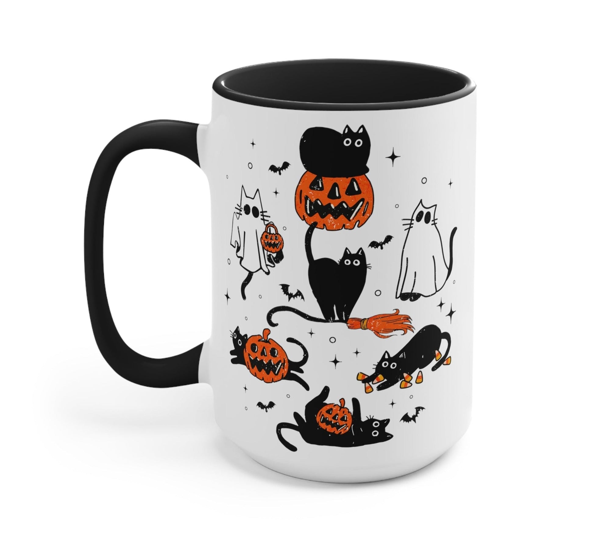 This is a Halloween-themed kitty ceramic mug that holds 15 fluid ounces of your favorite warm beverage. It features a white ceramic exterior with a black handle and black inside, and comes with either a one- or two-sided design. The mug is microwave and dishwasher safe, making it convenient for everyday use. Suitable for anyone who enjoys themed drinkware for coffee, tea, or hot chocolate.