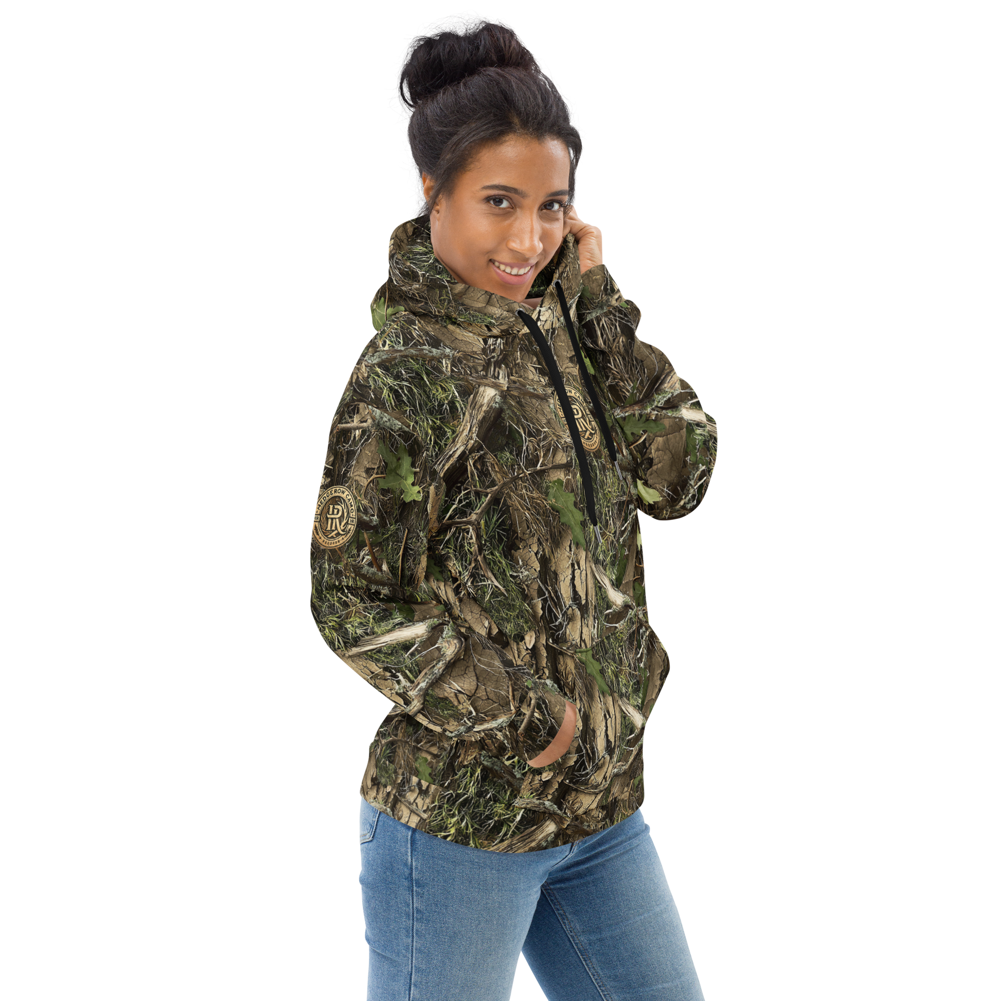 The HedgeRow Camo Unisex Hoodie combines comfort and durable design for everyday wear in various settings like woods or urban areas. It features a soft cotton-feel exterior with an all-over HedgeRow camo print and a soft brushed fleece lining inside. The hoodie is crafted from eco-friendly fabric composed of 95% recycled polyester and 5% spandex, offering warmth with a fabric weight of 9.08 oz./yd² (308 g/m²). It includes a double-lined hood with matching camo design on both sides and adjustable drawstrings to customize fit. Designed for unisex use, it is suitable for chilly mornings, cool evenings, or layering throughout the year. Its overlock seams add to lasting durability.