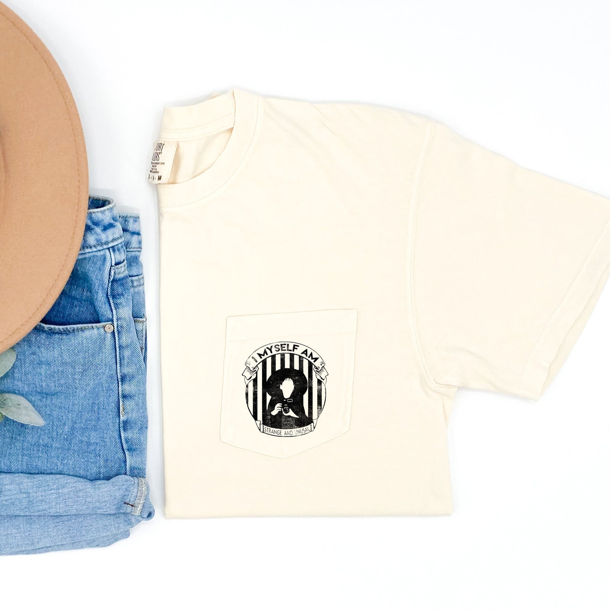 The I Myself Am Strange Halloween Pocket T-shirt is a unisex fitted shirt made from 100% combed ring-spun Comfort Colors cotton. It features a crewneck and contoured sides for a modern fit. Designed with state-of-the-art direct-to-film ink printing, the design is soft to the touch and durable without cracking. Suitable for casual Halloween wear, this pre-shrunk cotton tee is ideal for customers looking for a comfortable and stylish Halloween shirt.