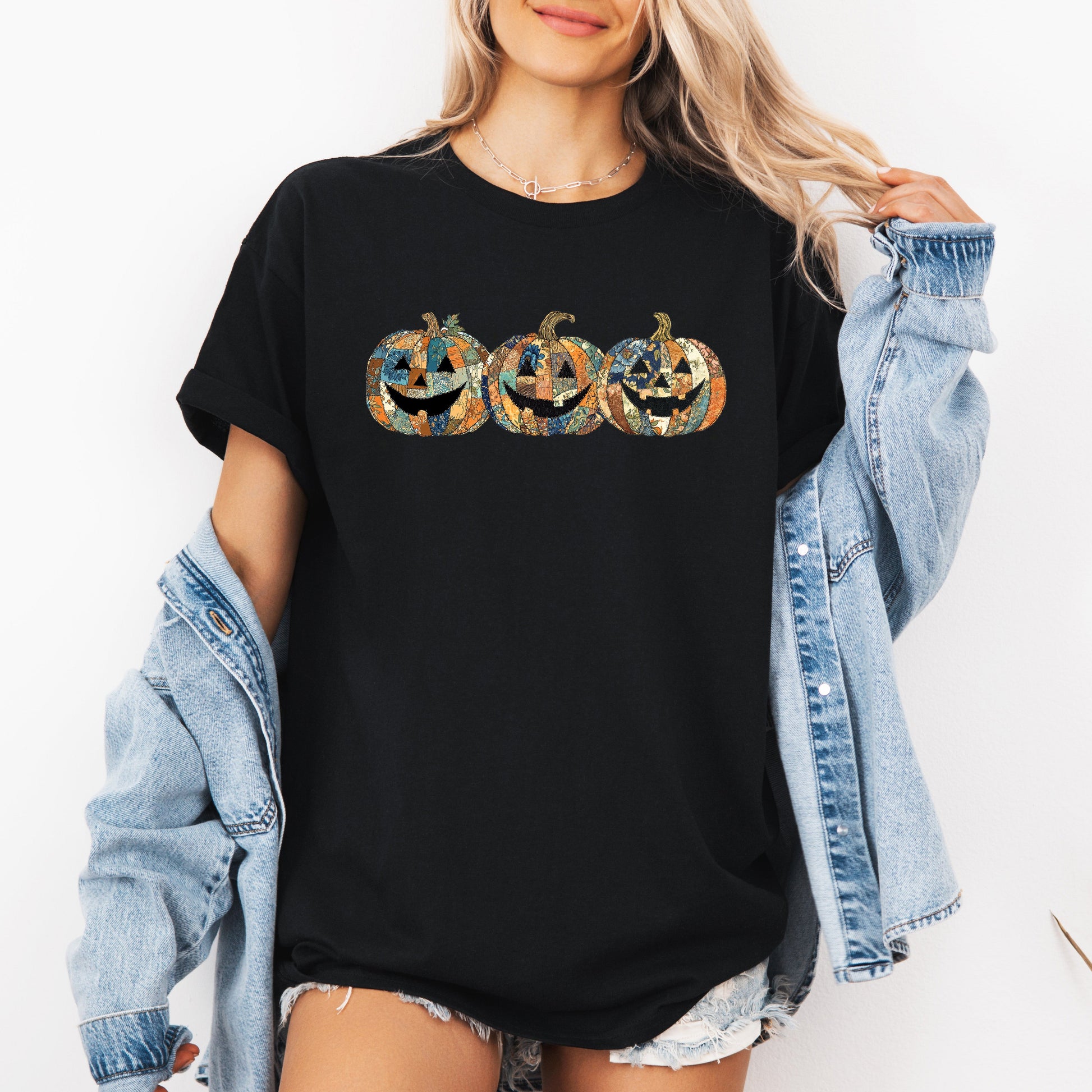 Add a dash of whimsy to your fall wardrobe with the Jack-o-Lantern Faux Quilt Pumpkin T-shirt. Celebrate the season with style and comfort, and let your love for Halloween shine through!