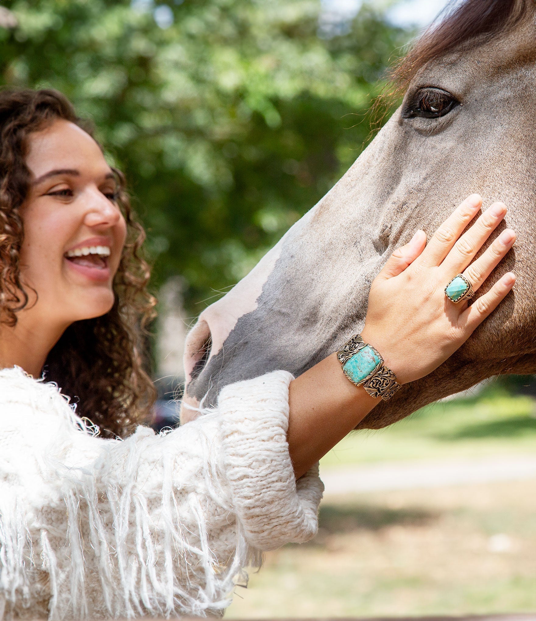 Adorn yourself in timeless beauty with this exquisite Jacquard Turquoise Solid Cuff Bracelet, featuring genuine bronze and turquoise in ornate detailing. This piece of wearable art is 2.5" inner diameter, with a stone of 1.25" x 1". Elevate your look with this stunning bracelet! π€©ππ