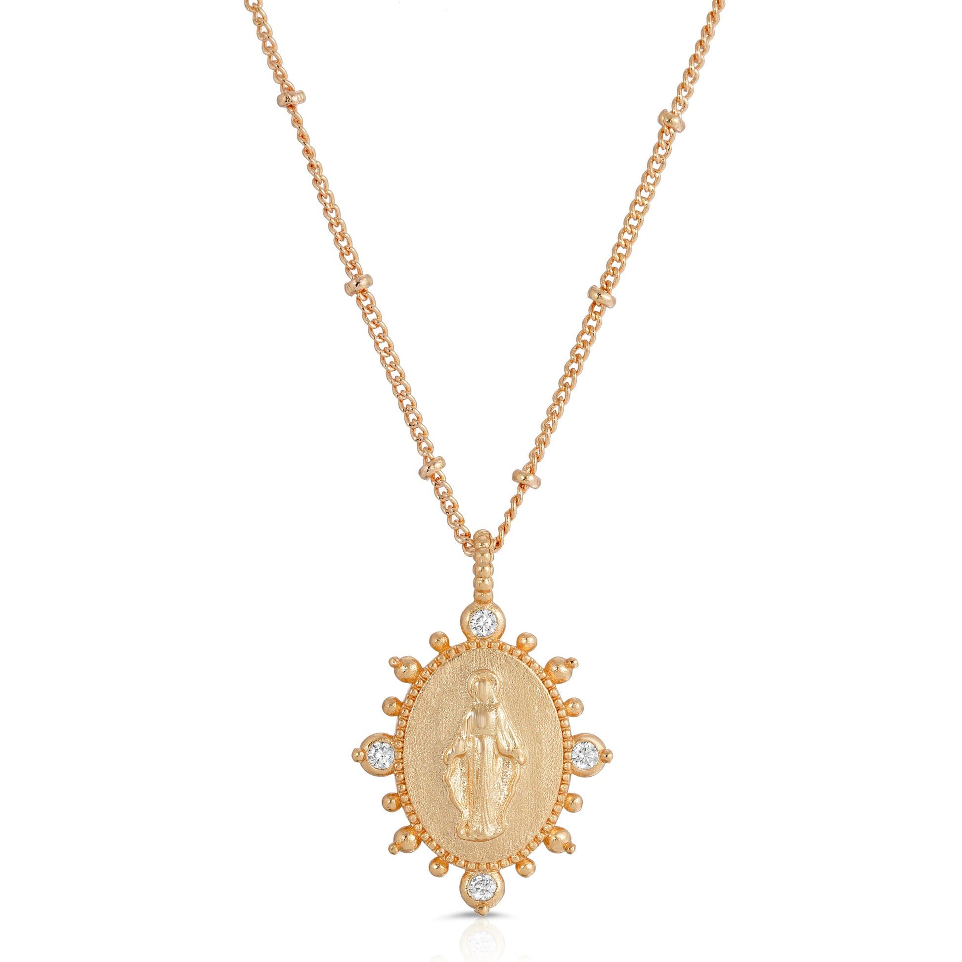 Beautifully ornate with a touch of divine glamour, the Lady Lourdes Pendant Necklace showcases an elegant oval medallion featuring the likeness of the Virgin Mary, framed by delicate milgrain detailing and shimmering cubic zirconia accents. A timeless piece that adds depth, sparkle, and spiritual grace to any necklace stack.