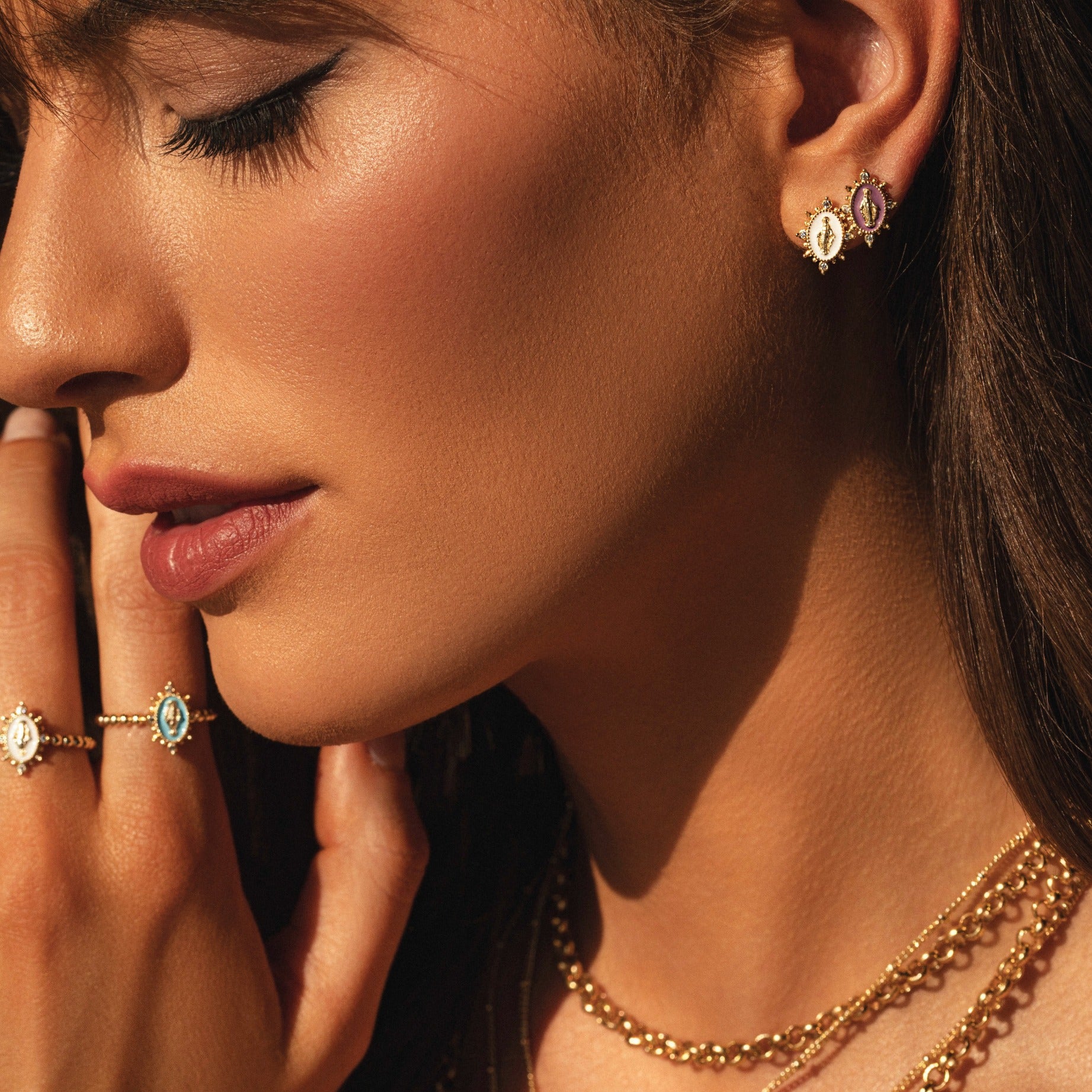 Deepen the faith with the Lady Lourdes Stud. Features a minimal stud with an aqua enamel pendant, highlighting a portrait of the Virgin Mary surrounded by ornamental CZ accents and embellished spike details. Perfect pop of color for an everyday look.