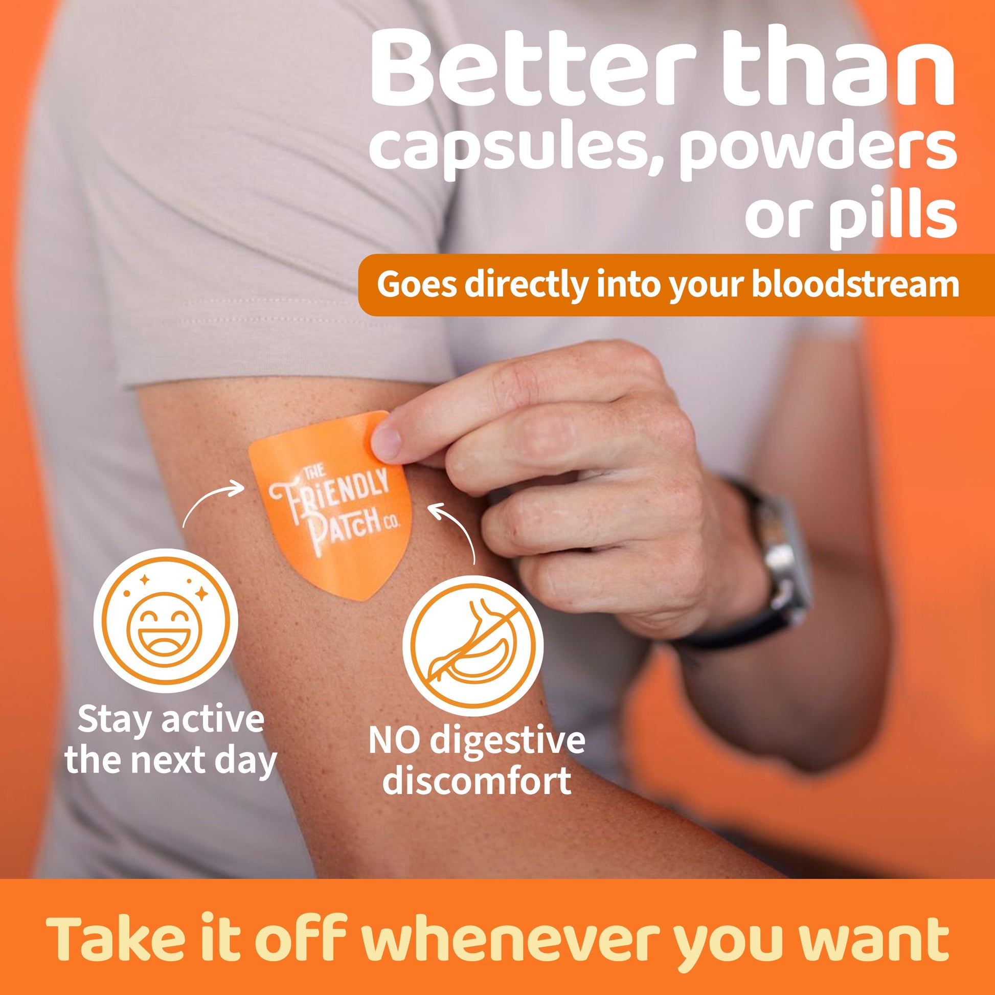 No pills or drinks are necessary with this party patch. There's no need to worry about having access to water; apply this patch and forget about it. Apply it before sleep or in the morning, and enjoy it throughout the night and day. Patches can be worn on the arm, wrist, and non-hairy areas. Just peel, stick, and enjoy!