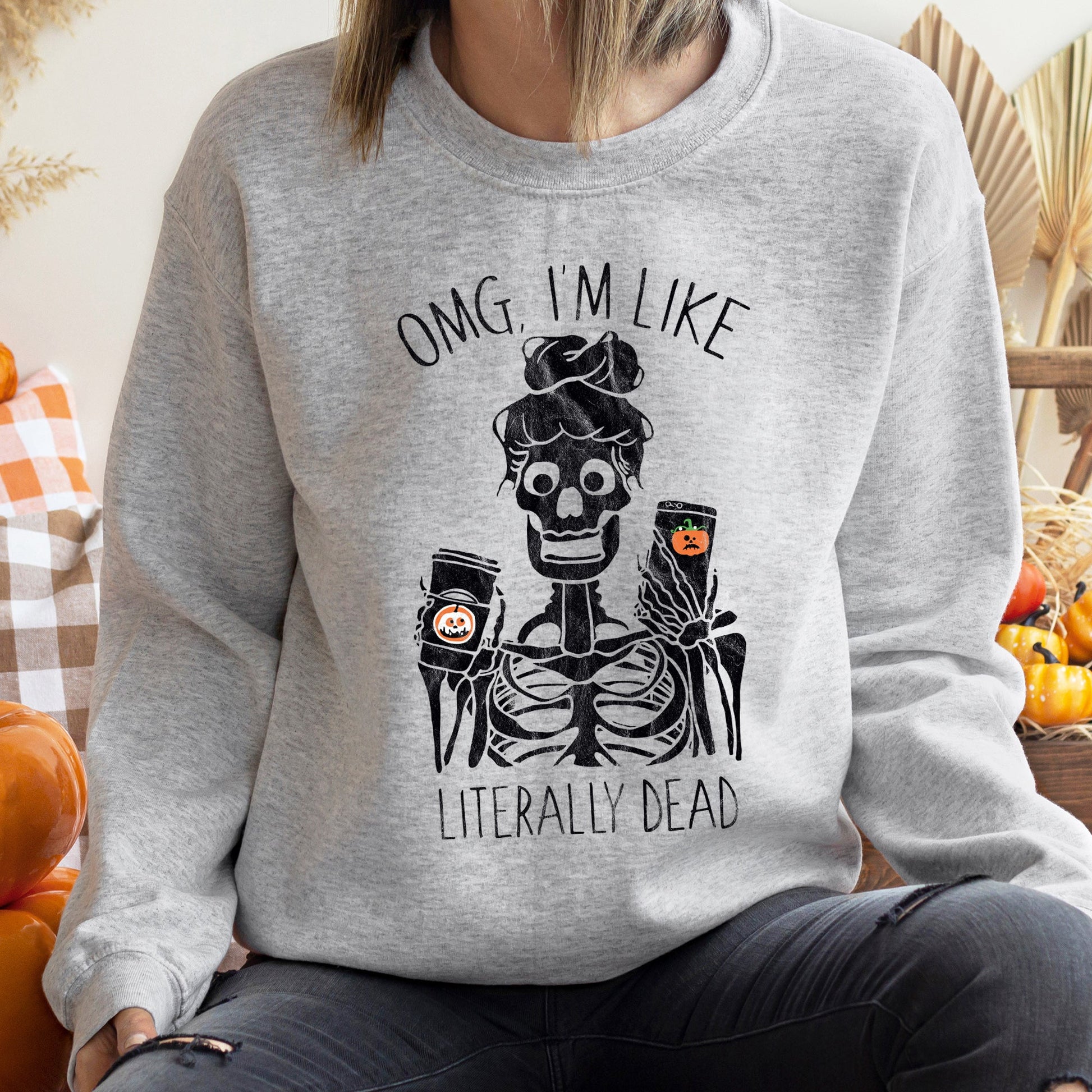 The Literally Dead Vintage Halloween Sweatshirt pairs effortlessly with jeans for a trendy, relaxed look. Layer it over your favorite shirts for added warmth and style, making it perfect for both casual outings and cozy nights in.