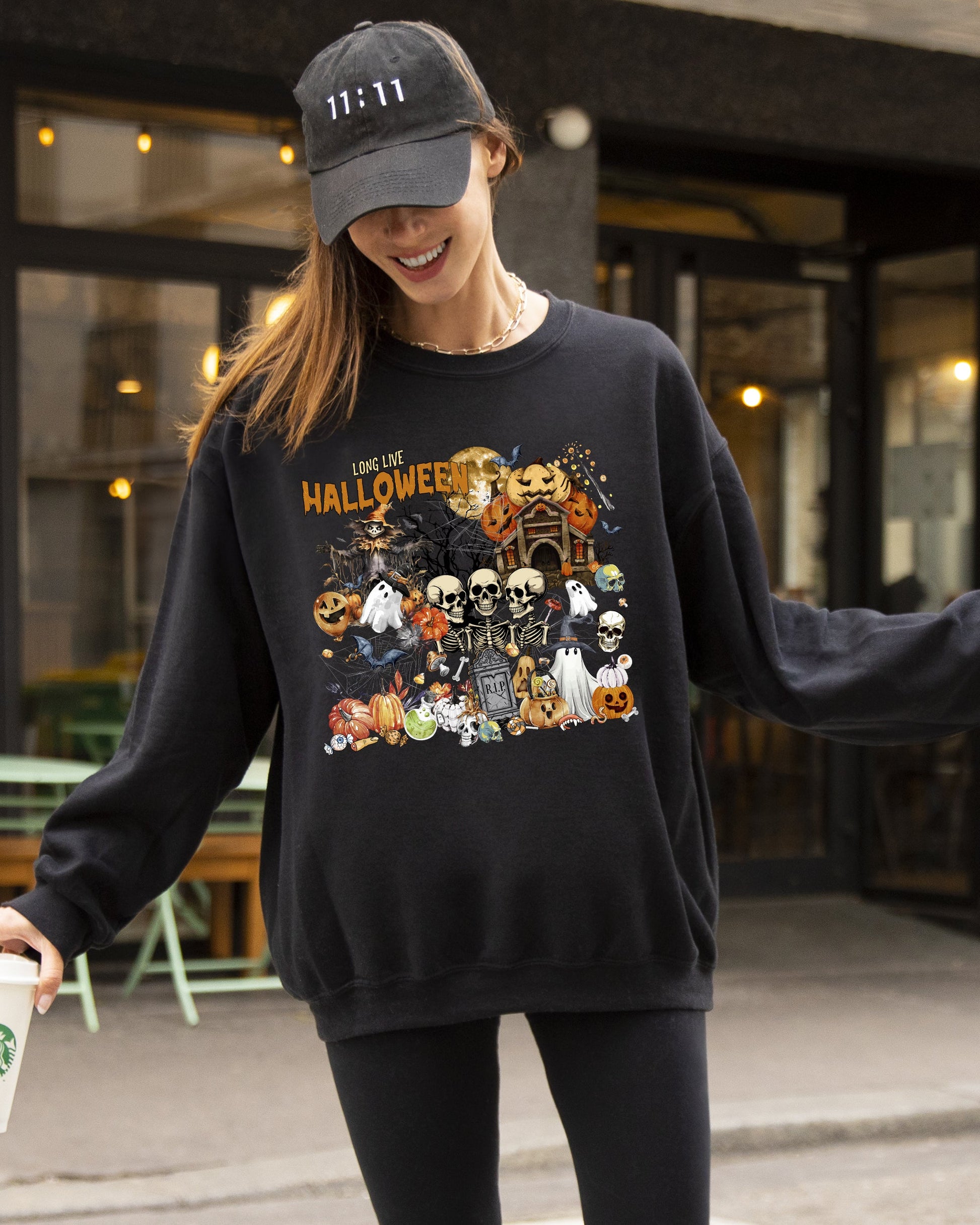 This Long Live Halloween, Spooky Scene, Witch, Skeleton, Ghost, Haunted Sweatshirt pairs effortlessly with your favorite jeans for a trendy, casual look. Layer it over a shirt for added flair, making it ideal for both festive outings and cozy nights in. Show off your Halloween spirit with this must-have addition to your wardrobe!