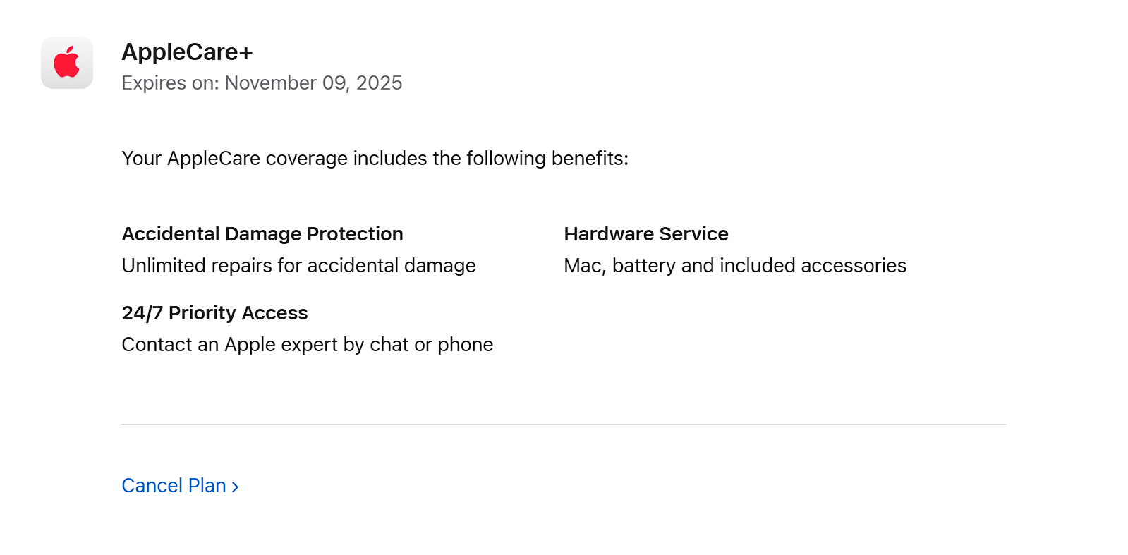 Warranty: It comes with AppleCare+ until 11/09/25 and 90-Day SafeTech Warranty with options to upgrade up to 3 Years.