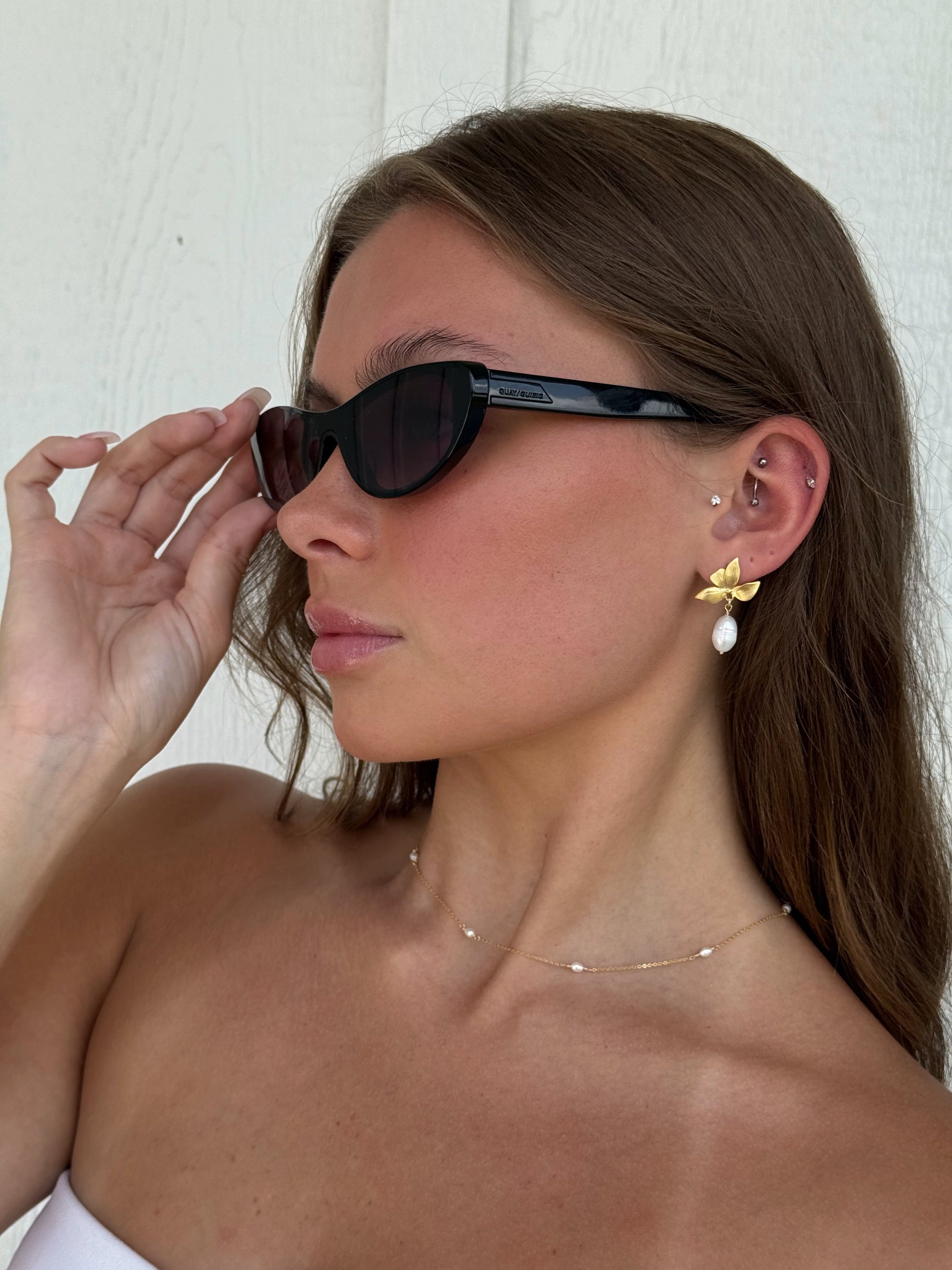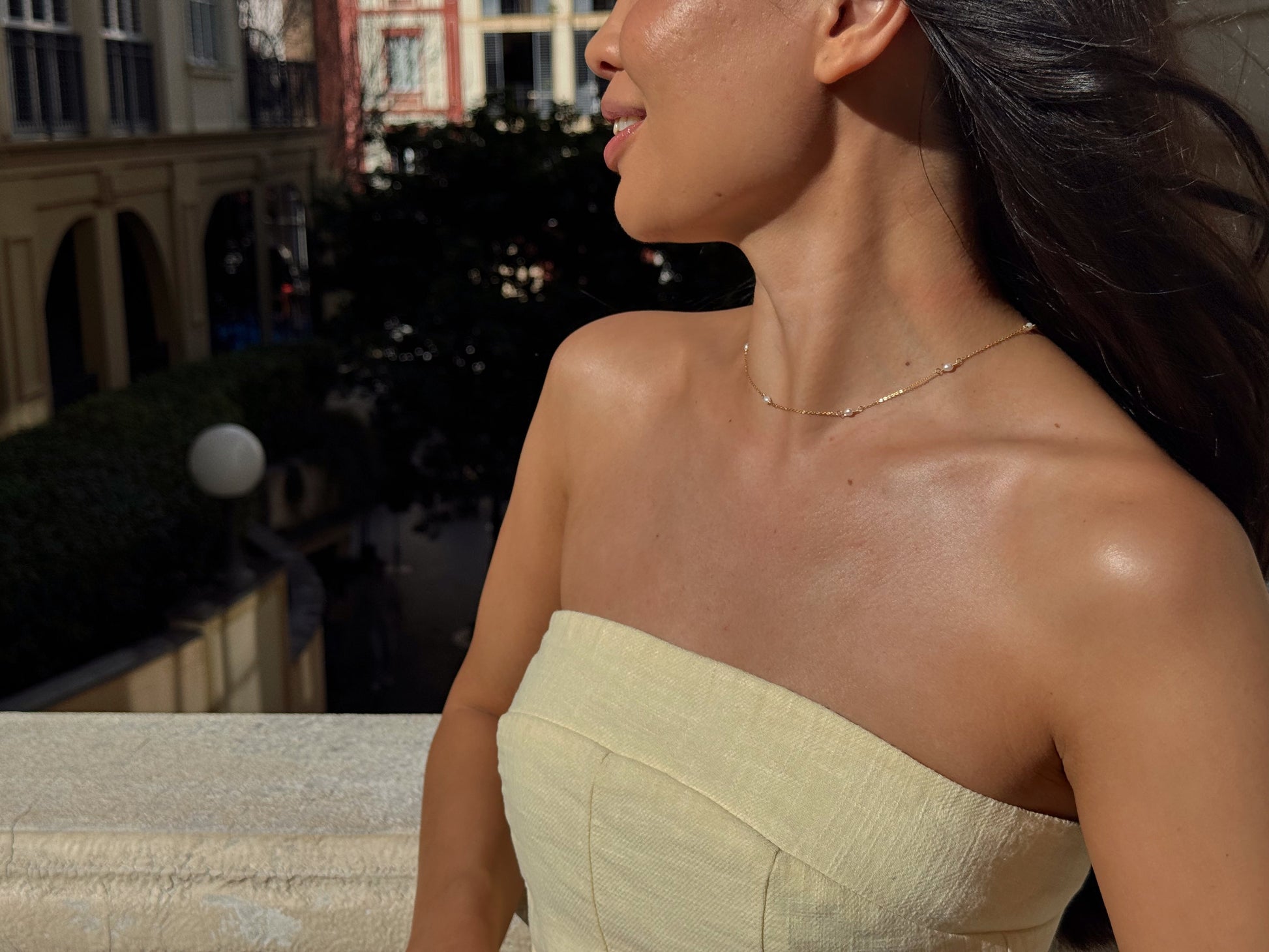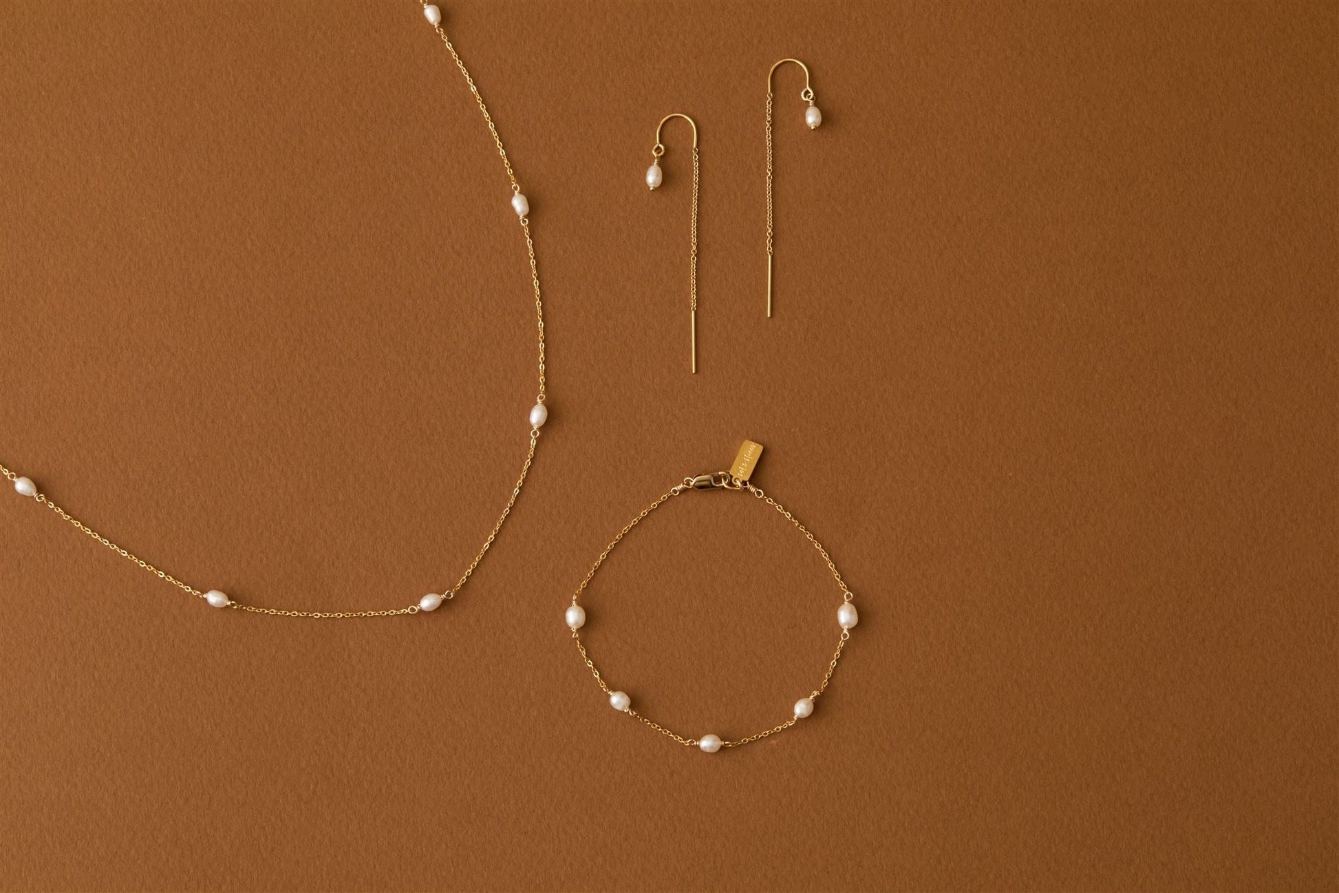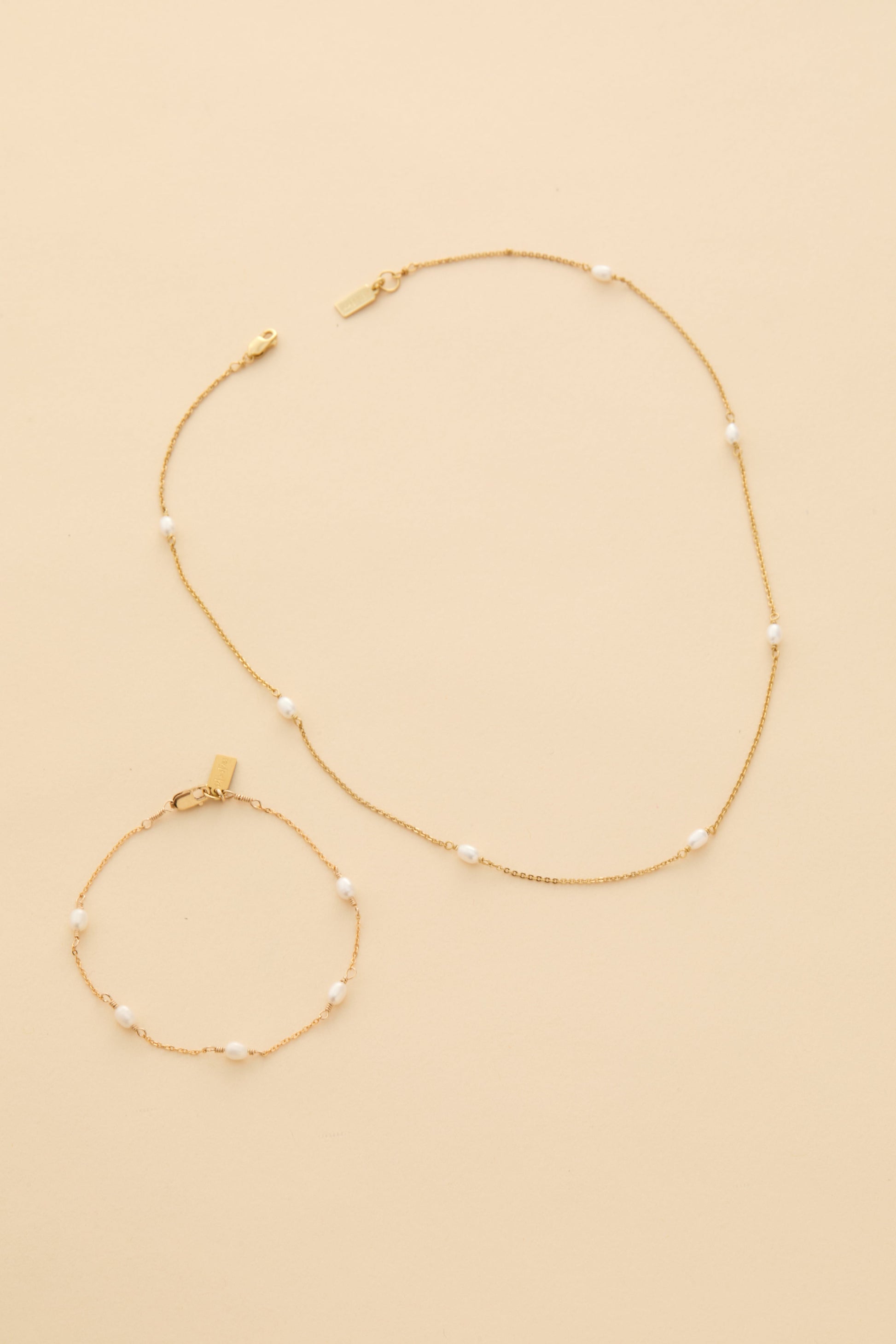 The Madeline Necklace features a 14k gold over brass or sterling silver chain with stationed freshwater rice pearls. Each pearl varies naturally, providing unique character. The 16-inch necklace has a lobster clasp for secure wear. Suitable for those who appreciate delicate and elegant jewelry. Wear gently and keep dry to maintain the pearls and metal finish.