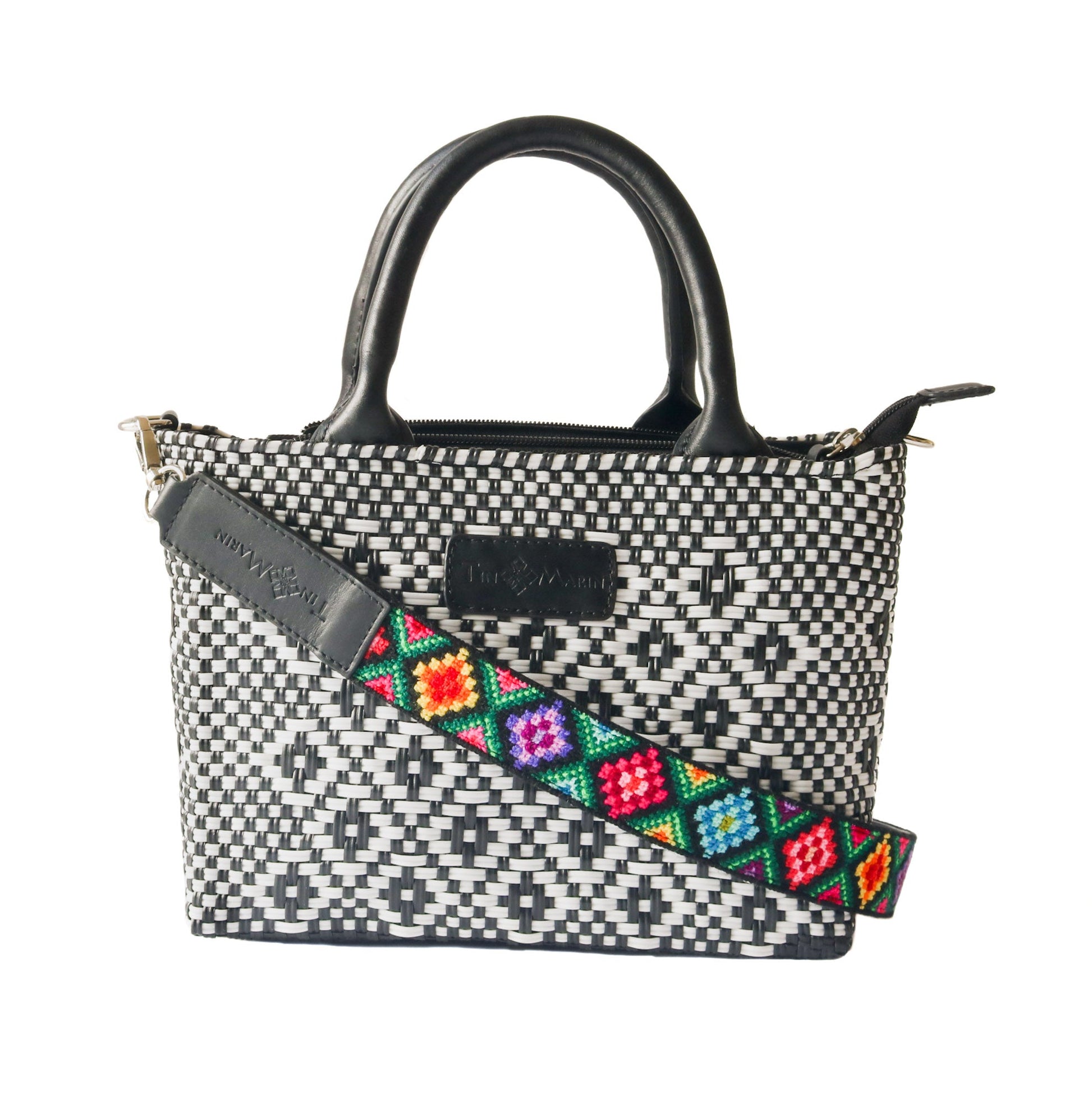 The Mai Woven Bag Strap is a handcrafted accessory designed to enhance Tin Marin bags. Created by the Tzeltal community in Chiapas, Mexico, it features vibrant quadrille cloth and detailed double cross-stitch embroidery. The strap is lined with genuine leather and attached with nickel hardware for durability. It is suitable for those seeking to personalize their bags with unique, artisan-made straps and can be easily clipped on or off to match different styles or occasions.