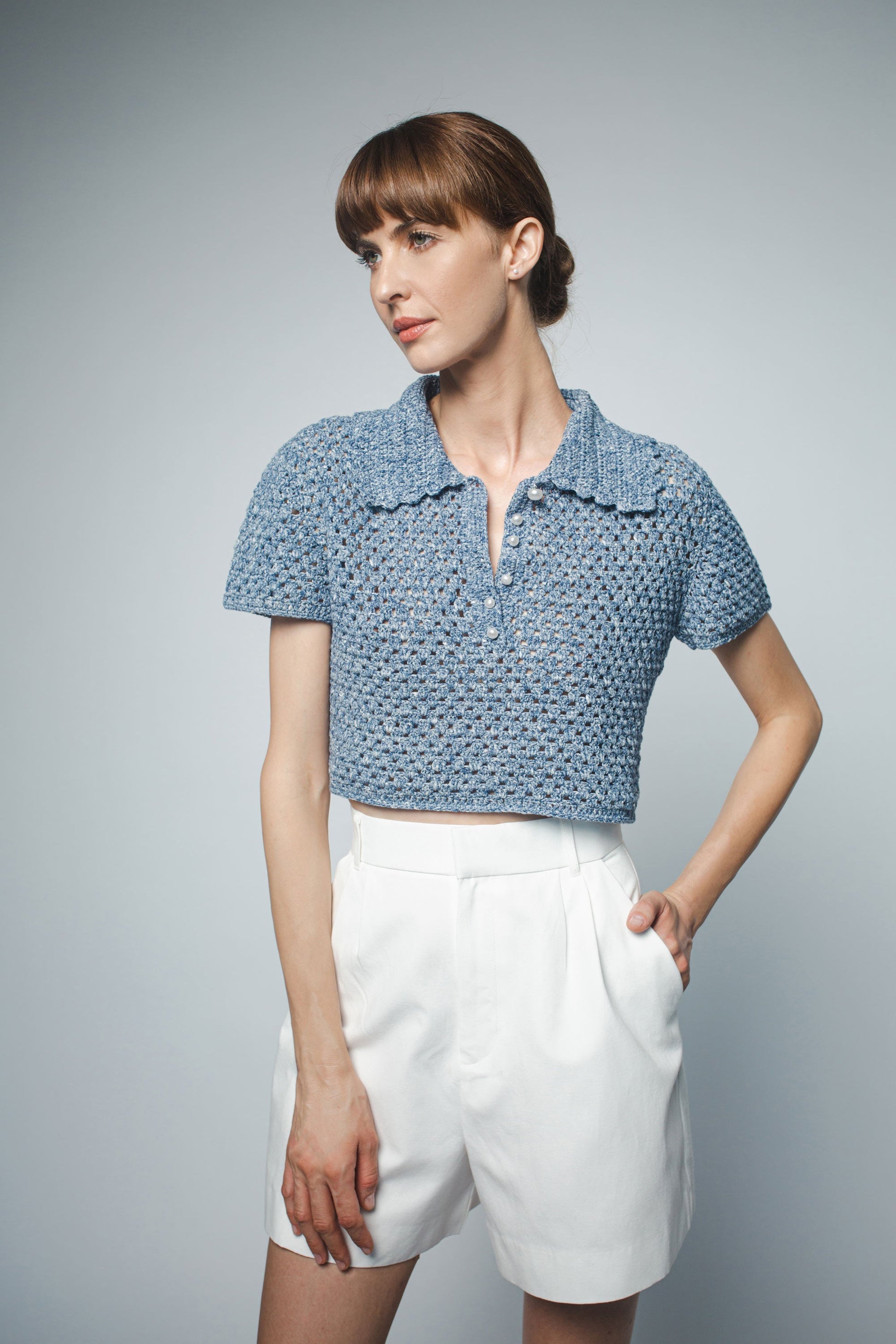 MARGOT HAND CROCHET CROPPED POLO IN BLUE DENIM