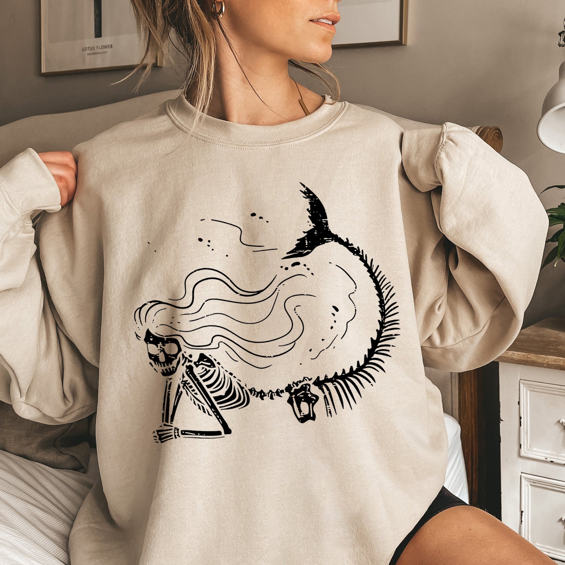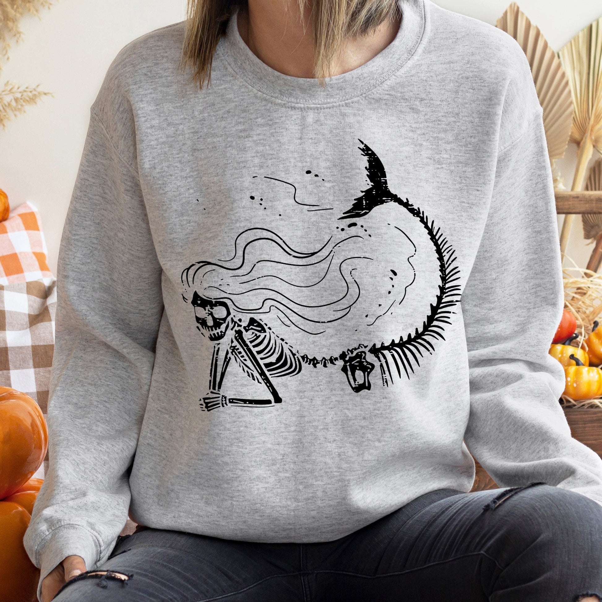 Get ready to stand out this Halloween with our Mermaid Skeleton Halloween Sweatshirt. This unique and eye-catching sweatshirt perfectly combines comfort and creativity, making it an essential addition to your seasonal wardrobe. Crafted from a premium cotton and polyester blend, it offers a soft fleece interior that keeps you warm during chilly autumn nights while ensuring a cozy fit.